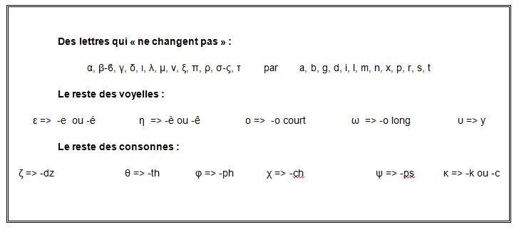 Ce n’est pas tout de donner des règles, l’alphabet grec et les usages de la translitération ne sont pas faciles à manipuler. Donc pour assimiler tout ça je vous propose de le pratiquer. Désormais, en lisant ce qu’il y a au-dessus c’est accessible à tout le monde et chacun peut le tenter. Alors lancez-vous !! :clin-oeil: