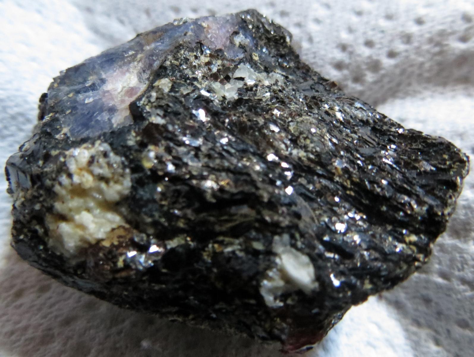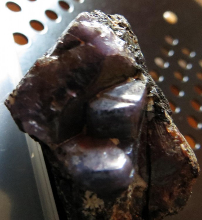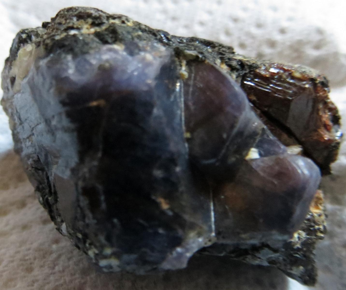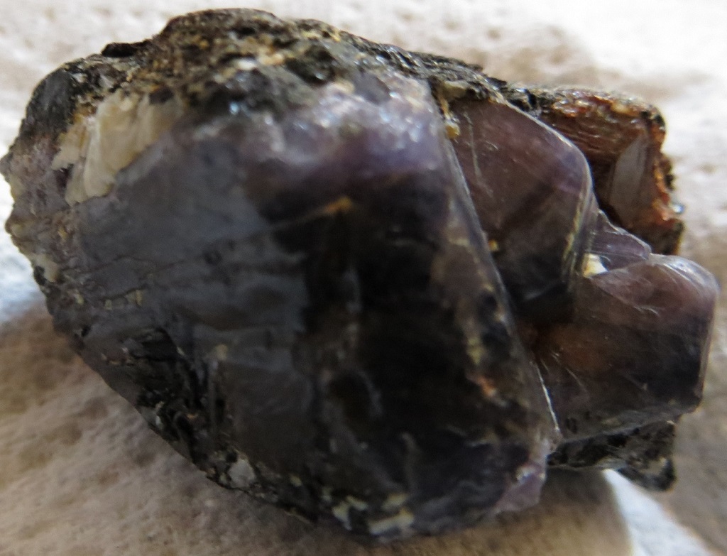 [carbo-3b.jpg], [carbo-3c.jpg] : Le minéral principal est pourpre et présente des cristaux hexagonaux : corindon versus lépidolite ? Je note un cristal brun en haut à droite qui me fait un peu penser à un zircon ?