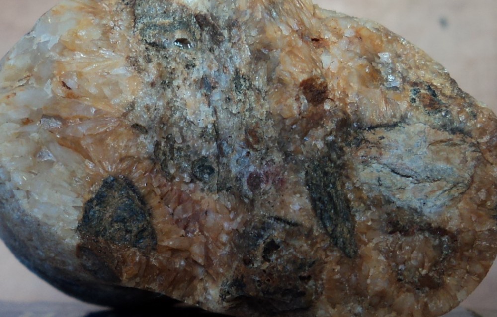 Dans cette roche, à part du quartz il y a des traces de feldspath (couleur orangée)