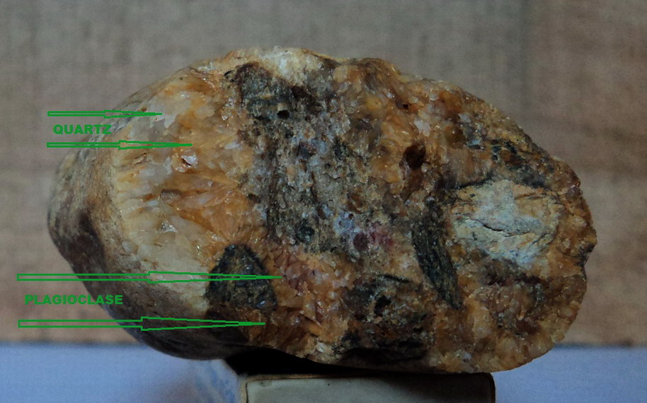 Les éléments noirs anguleux de taille diverses, les cristallisations radiales en périphérie des éléments sombres démontrent qu'il existe une chronologie précise, les plagio et le quartz sont postérieurs (remplissage filonien) aux éléments ferromagnésiens.