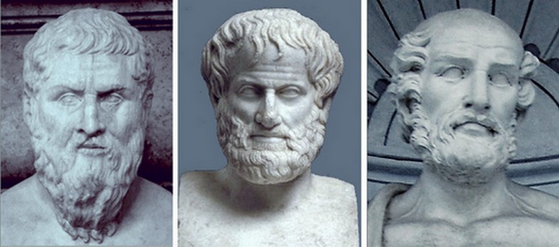 De gauche à droite : Platon, Aristote, Théophraste - Thofrasto Orto botanico.
