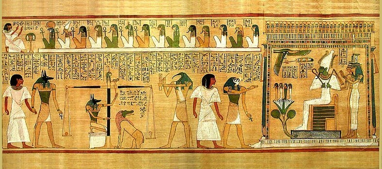 Rituel de la pesée l'âme ... sur la balance de Maât, Anubis, Ammit la dévoreuse, Thowt, Horus, Osiris accompagné d'Isis et de Nephtys sont présent pour la cérémonie...