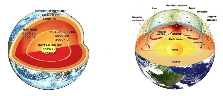 De gauche à droite : Structure interne de la terre et plaques tectoniques.