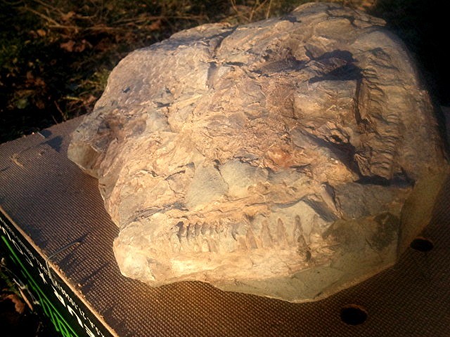 Aux vues des photos , pour moi je m'orienterai bien vers du reptile marin , quoi que sur les photos , on peu surtout s'apercevoir qu'il s'agit d'empreinte du fossile ( vous avez le négatif ) les dents sont en creux ...