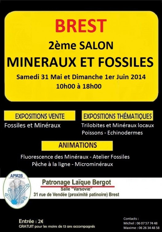 Ce salon destiné au amateurs de fossiles et minéraux se déroulera le 31 mai et le 1er juin 2014 au patronage laïque du Bergot, 31 rue de Varsovie dans le quartier de Bellevue à Brest.