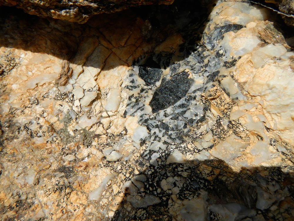 Dans cette pegmatite du même secteur, la tourmaline se situe près des épontes et dans le fedspath principalement...