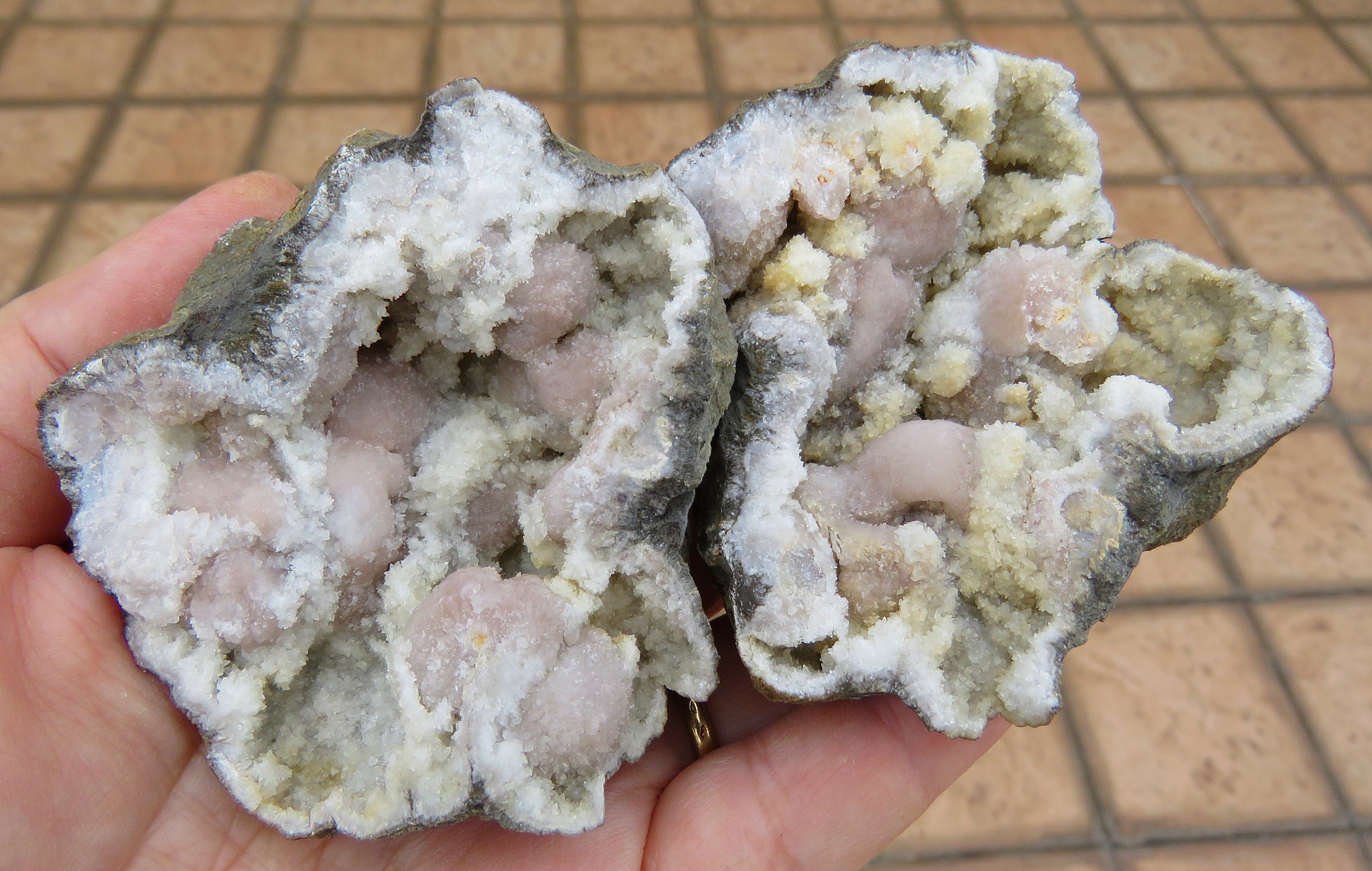Quant à la formation en boules qui m'intrigue aussi beaucoup, elle prend parfois l'aspect de "pelure d'oignon", la couche superficielle sautant à l'ouverture de la géode quand elle est trop fine (2 photos de boules ainsi décapées)! Heureusement, celles-ci ne sont pas des roses :surpris: