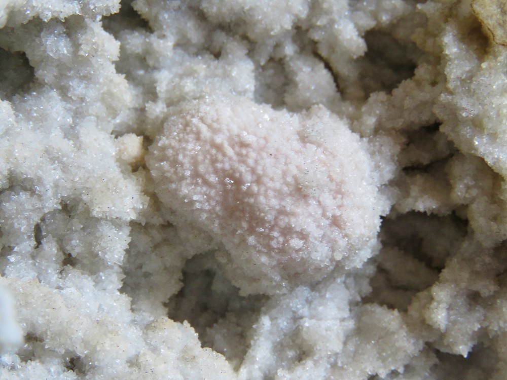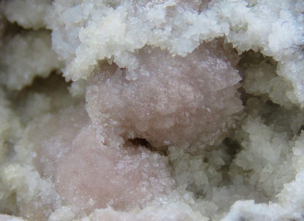 La piste "manganèse" n'est donc peut-être pas à exclure. Voici une image en macro d'une boule de quartz sur un autre spécimen qui évoque de manière surprenante les minéraux à manganèse (calcite manganésifère, rhodochrosite de Bulgarie... )