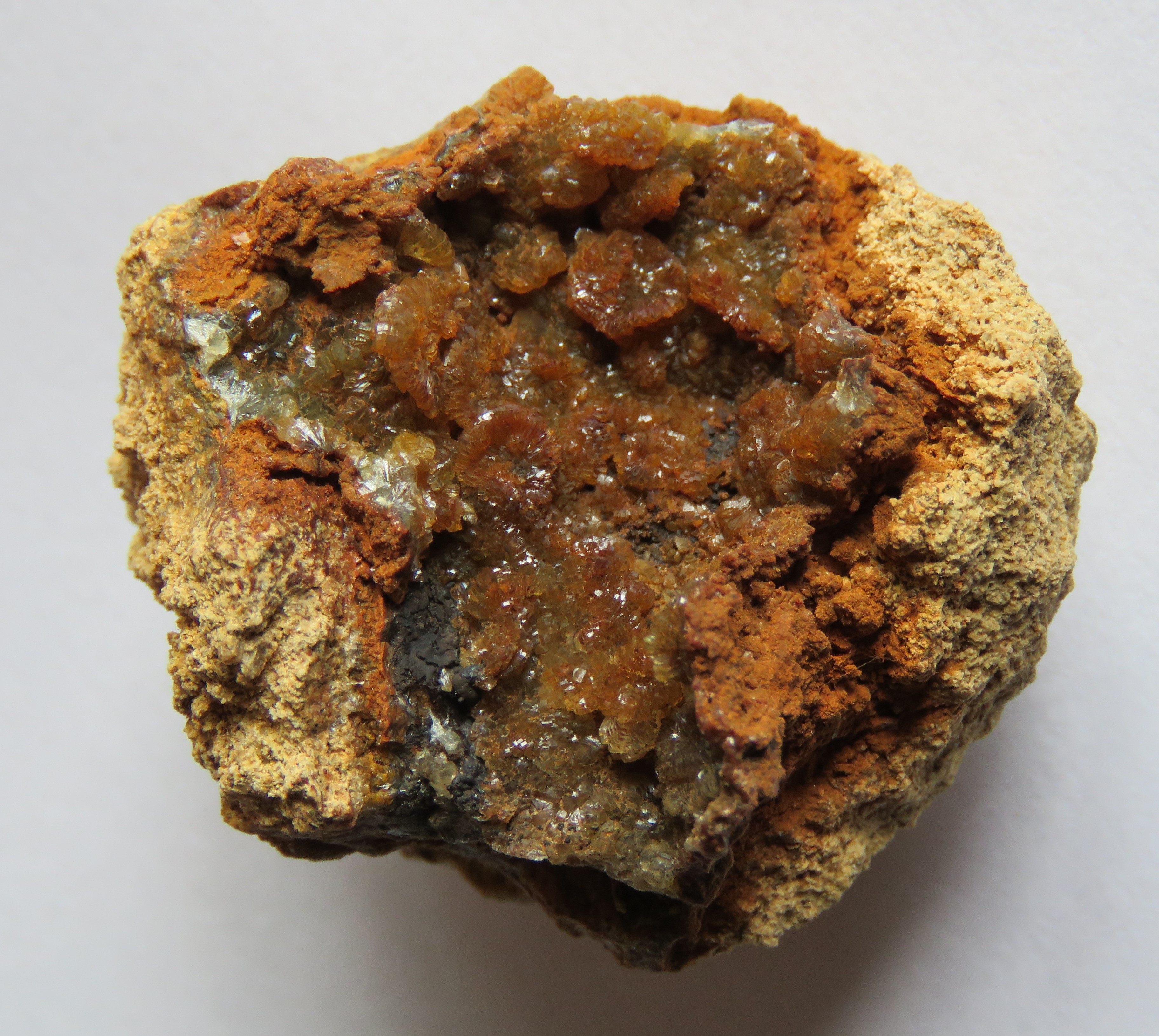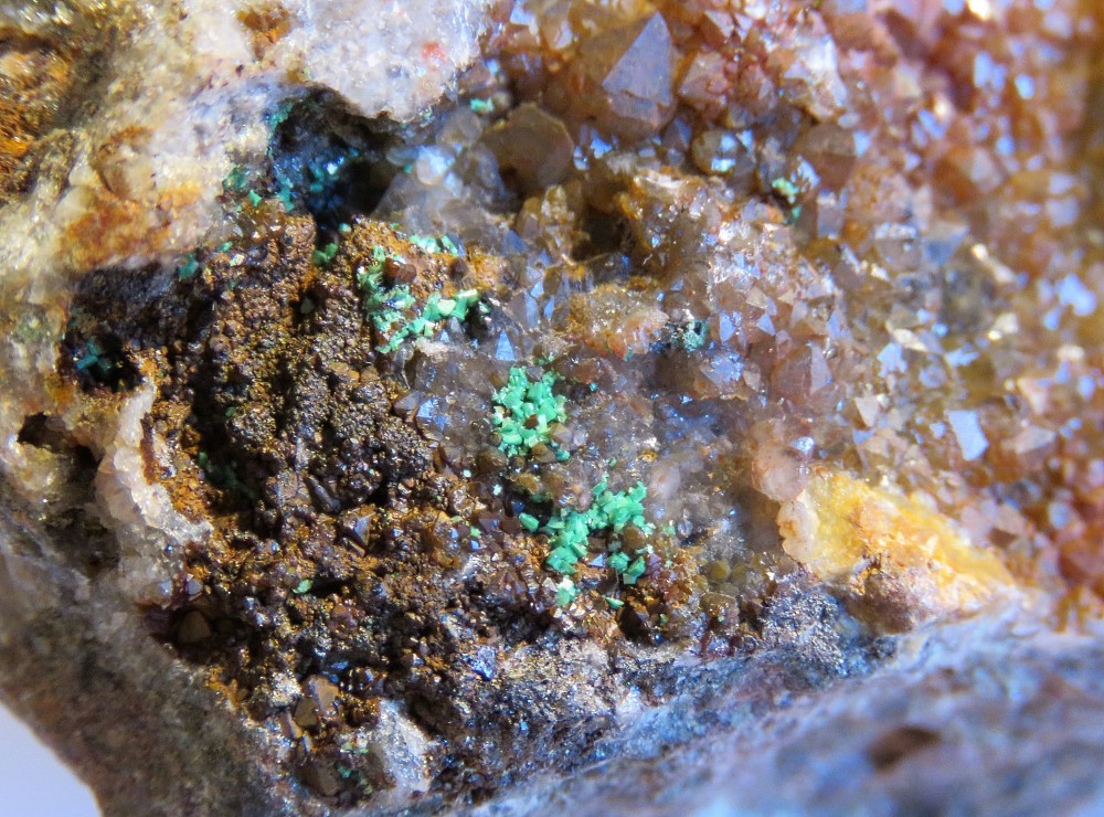 Aujourd'hui, nous sommes allés en famille à un vide-grenier à Marvejols, où une dame vendait quelques minéraux et fossiles récoltés par son fils il y a au moins une trentaine d'années, avant que cette passion ne lui passe.... Il n'a prospecté apparemment que dans les environs proches de Marvejols. Parmi ces pièces, modestes mais clairement locales, une m'a particulièrement attiré l'oeil. C'est un granite rosé portant une face minéralisée en quartz hématoïde/fumé, avec des pyrites octaédriques plus ou moins oxydées, quelques enduits noirs (coffinite? avec écailles de torbernite), une plage jaune/orange vif, et de la torbernite en cristaux millimétriques très bien formés.