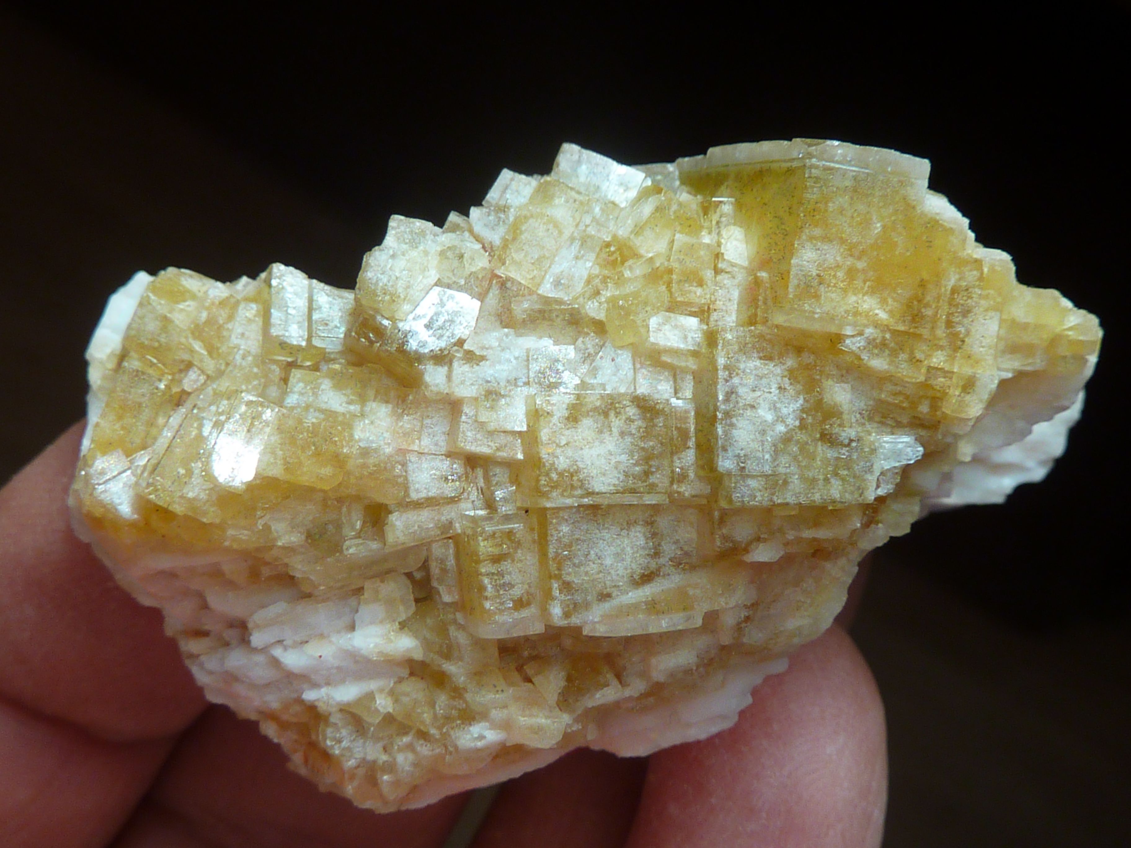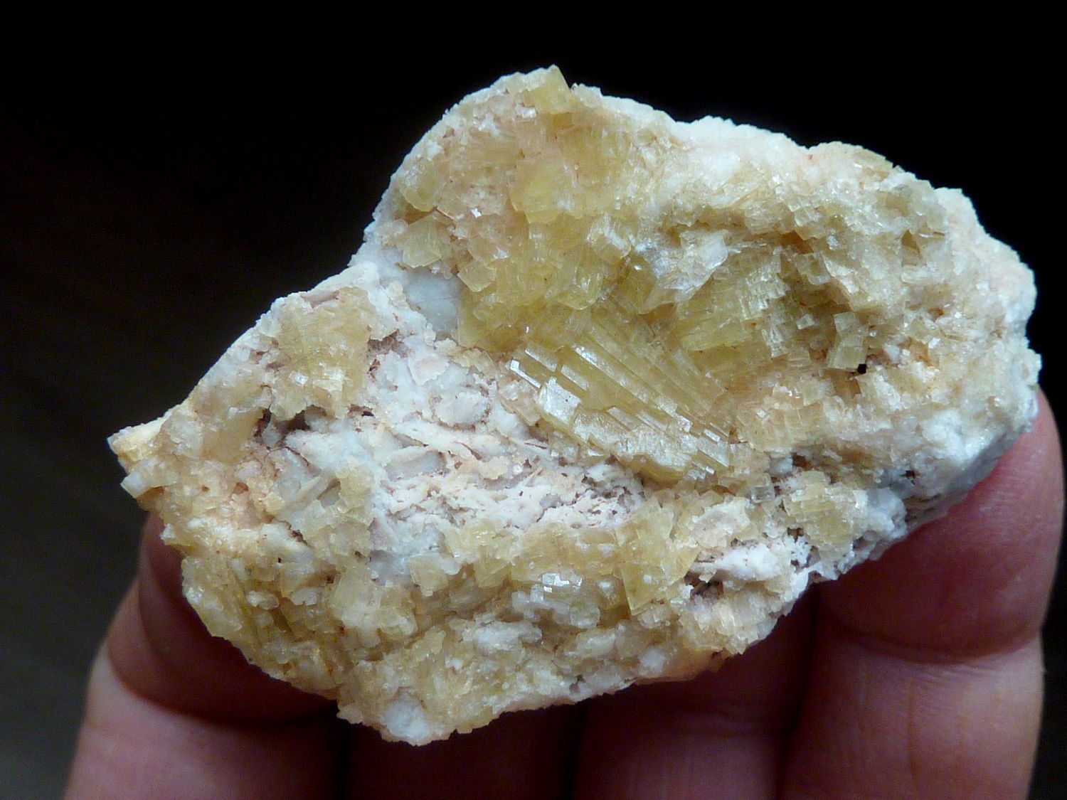 Pour comparaison, une barytine jaune de Montmirat. Les cristaux ont là un autre habitus: tabulaires, fins, biseautés sur les bords longs, typiquement groupés en faisceaux, parfois groupés en roses. Ce fut une trouvaille unique dans une lentille argileuse de l'Hettangien dolomitique. Ces bêtes-là sont très fortement fluorescentes en blanc-jaune aux UV longs.