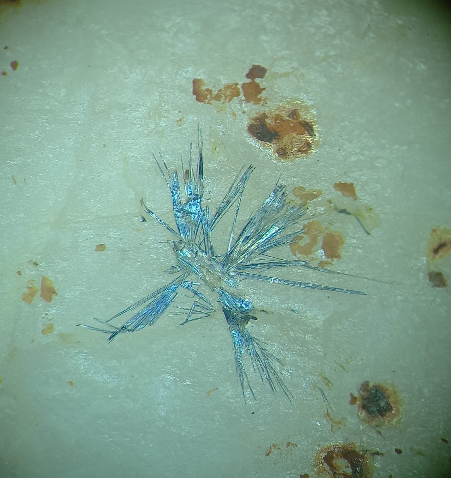 Une "étoile" de fines aiguilles de stibine de presque 1 cm de diamètre: