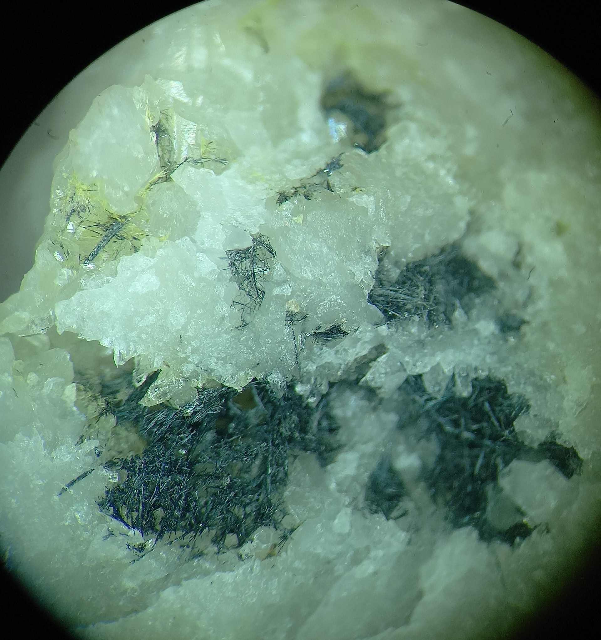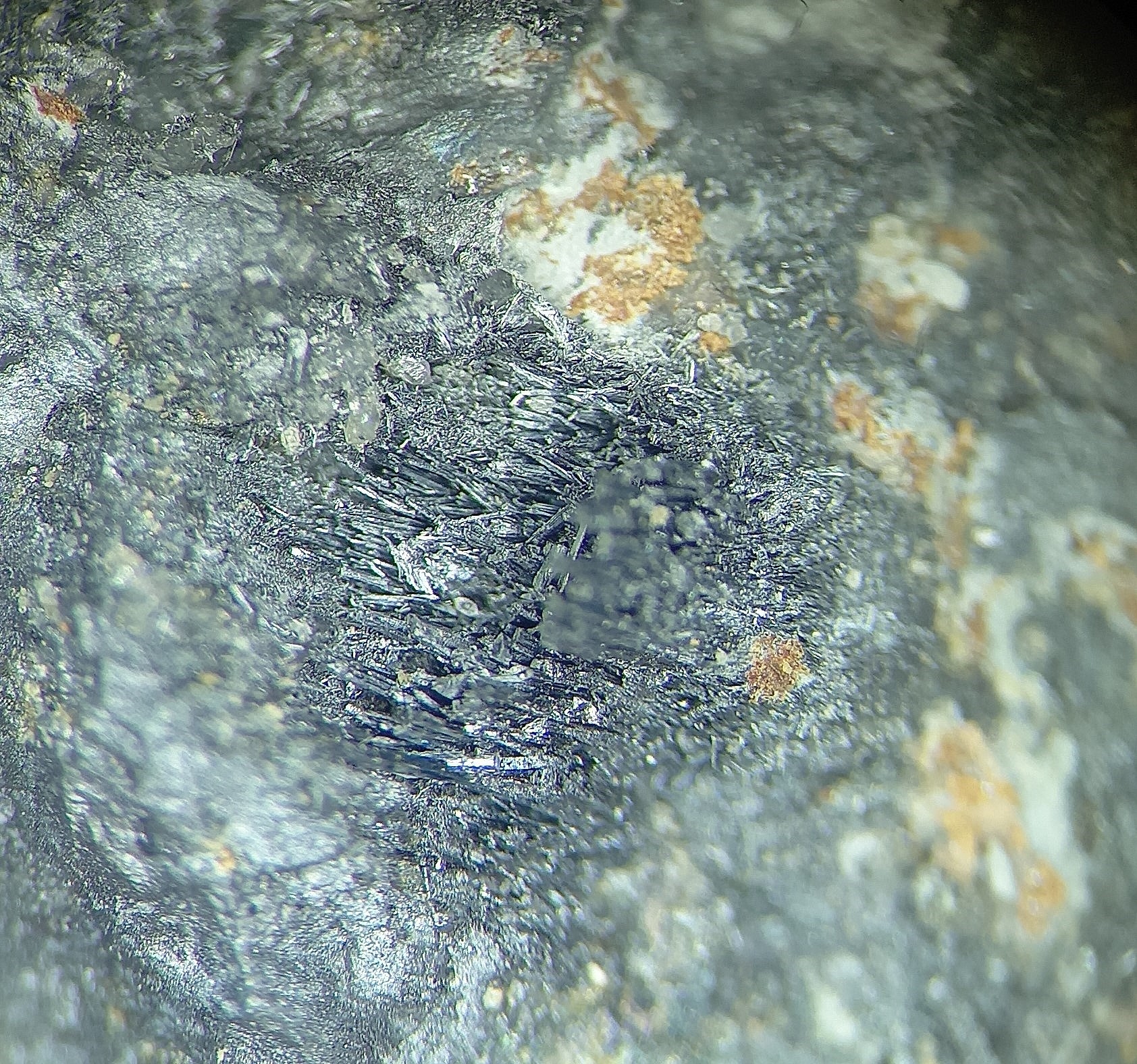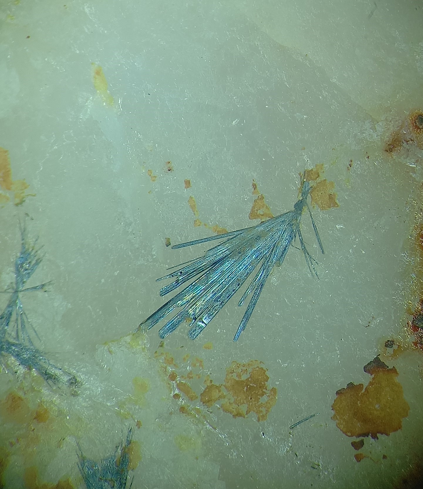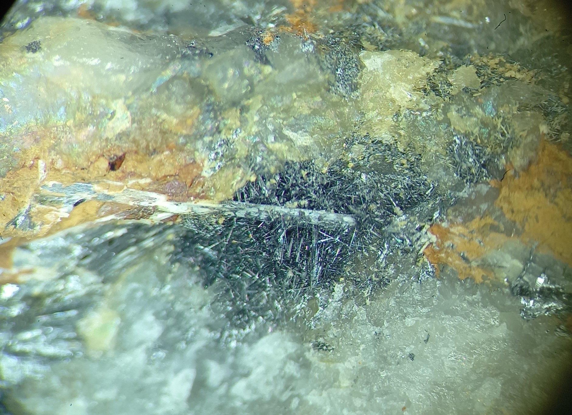 Stibine dans quartz, avec dans les micro-géodes du quartz un minéral métallique gris plomb cristallisé en feutrage de fines aiguilles : boulangérite, semseyite, zinckénite ? En tout cas, c'est rigolo, ça nous change des minéraux communs plus au nord de la Lozère.