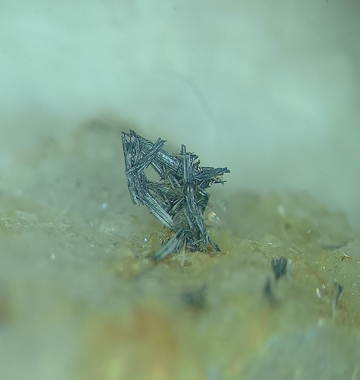 Stibine en feutrage dans un creux du quartz, même provenance