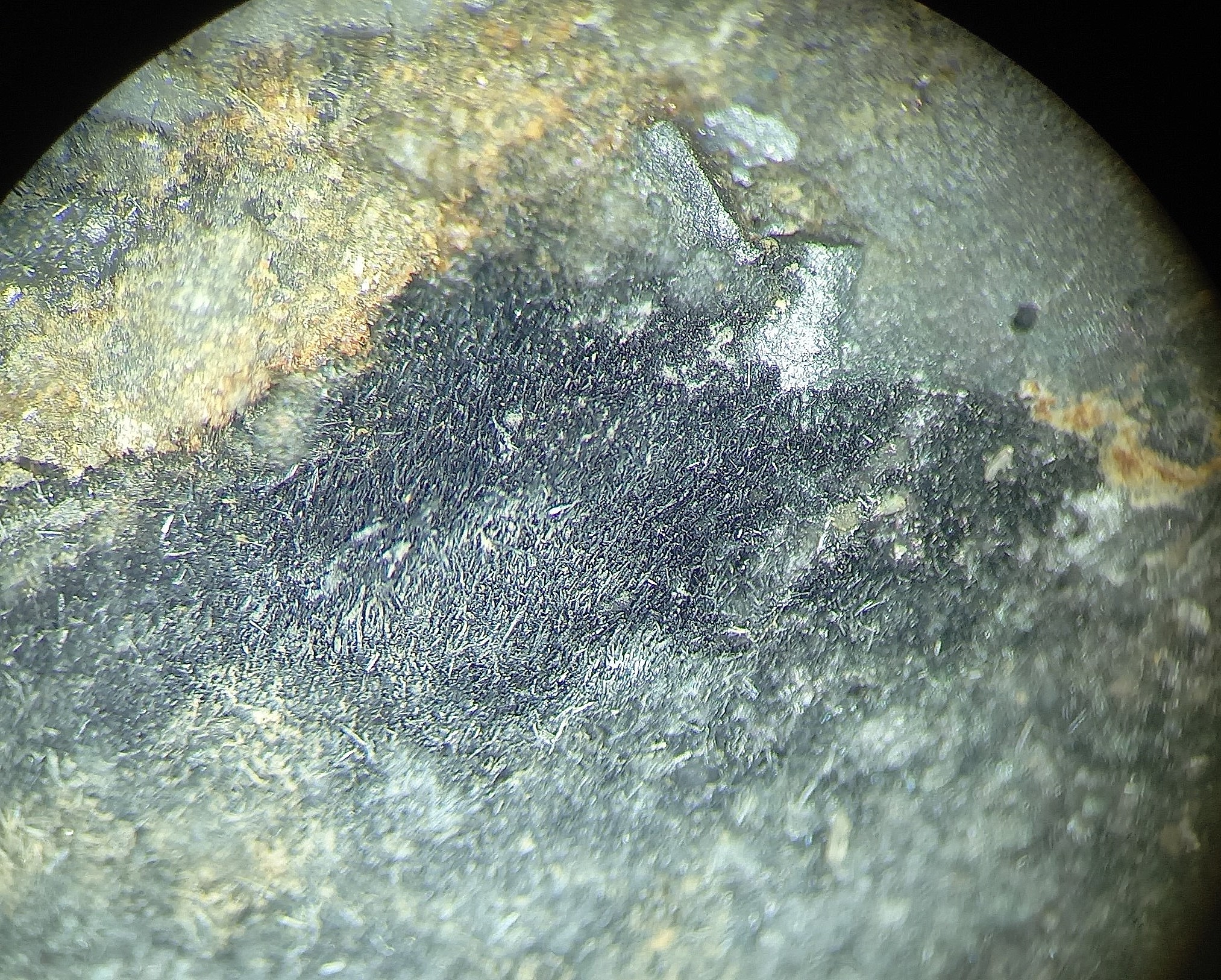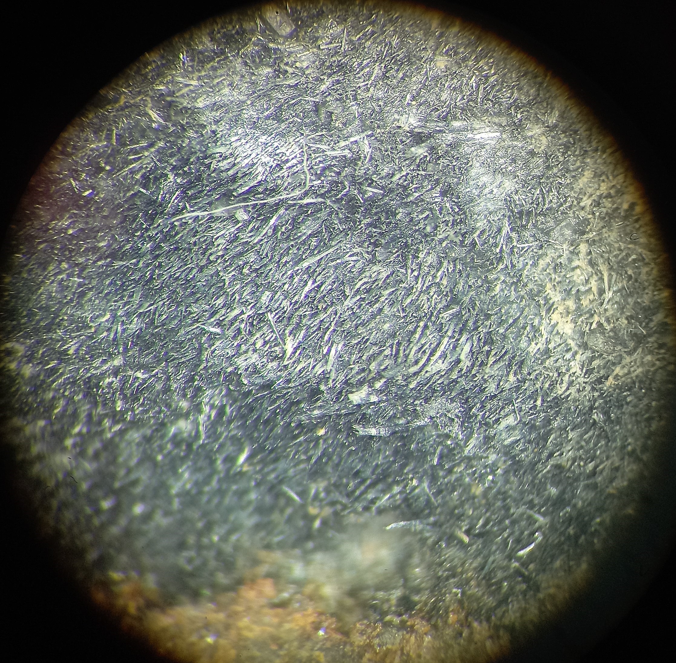 C'est hélas au-delà des possibilités de mon système très sommaire de prises de vues macro. La couleur de ce minéral de manganèse est marron argenté, l'éclat est métallique. On devine des faces cristallines à cause d'un scintillement, mais je ne pourrais pas y reconnaitre de forme géométrique au plus fort grossissement.