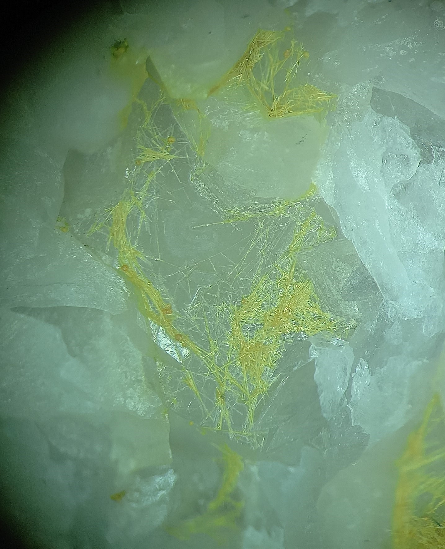 Stibiconite et barytine dans le quartz, teintés d'ocres d'antimoine, vue 7 mm