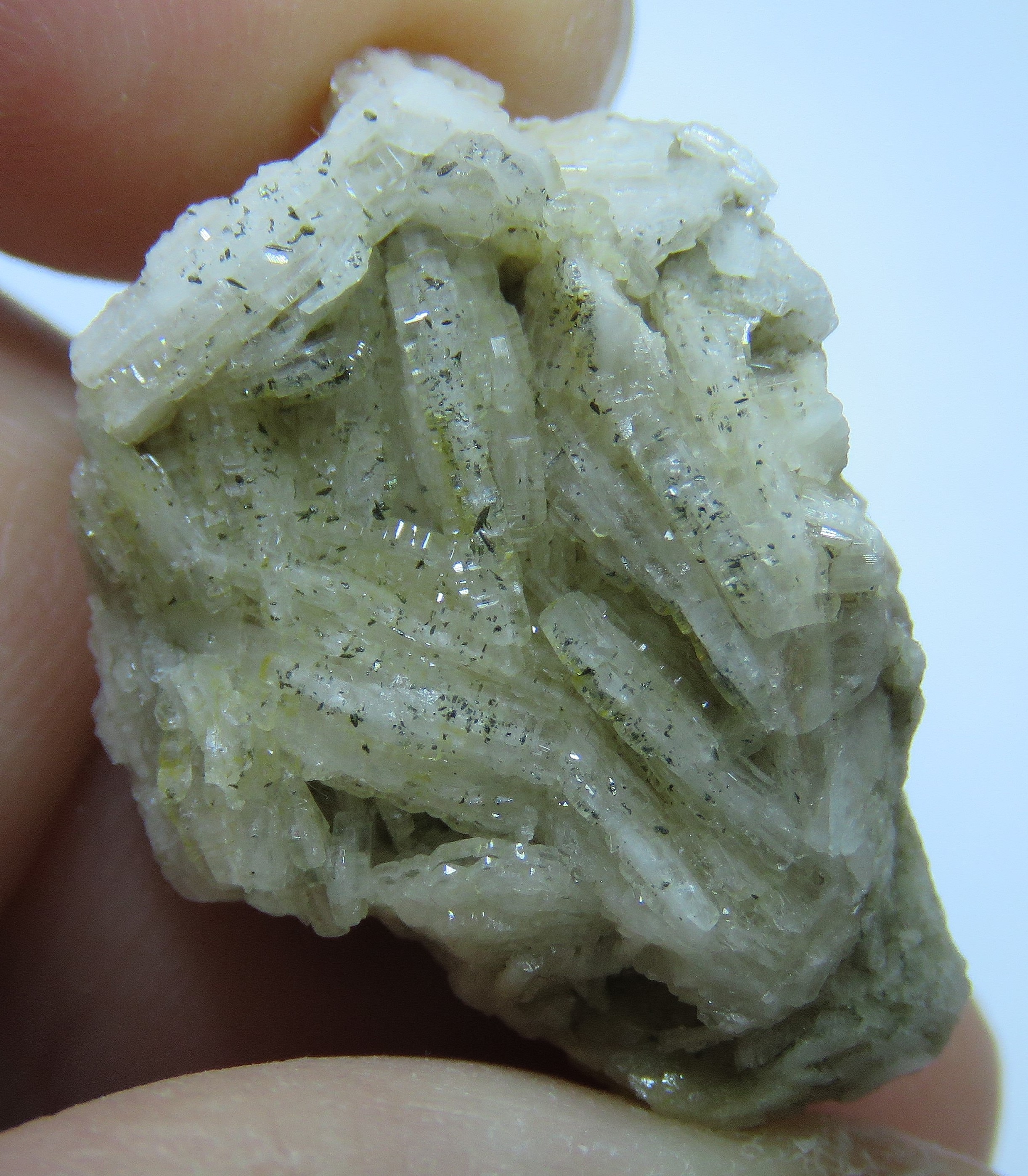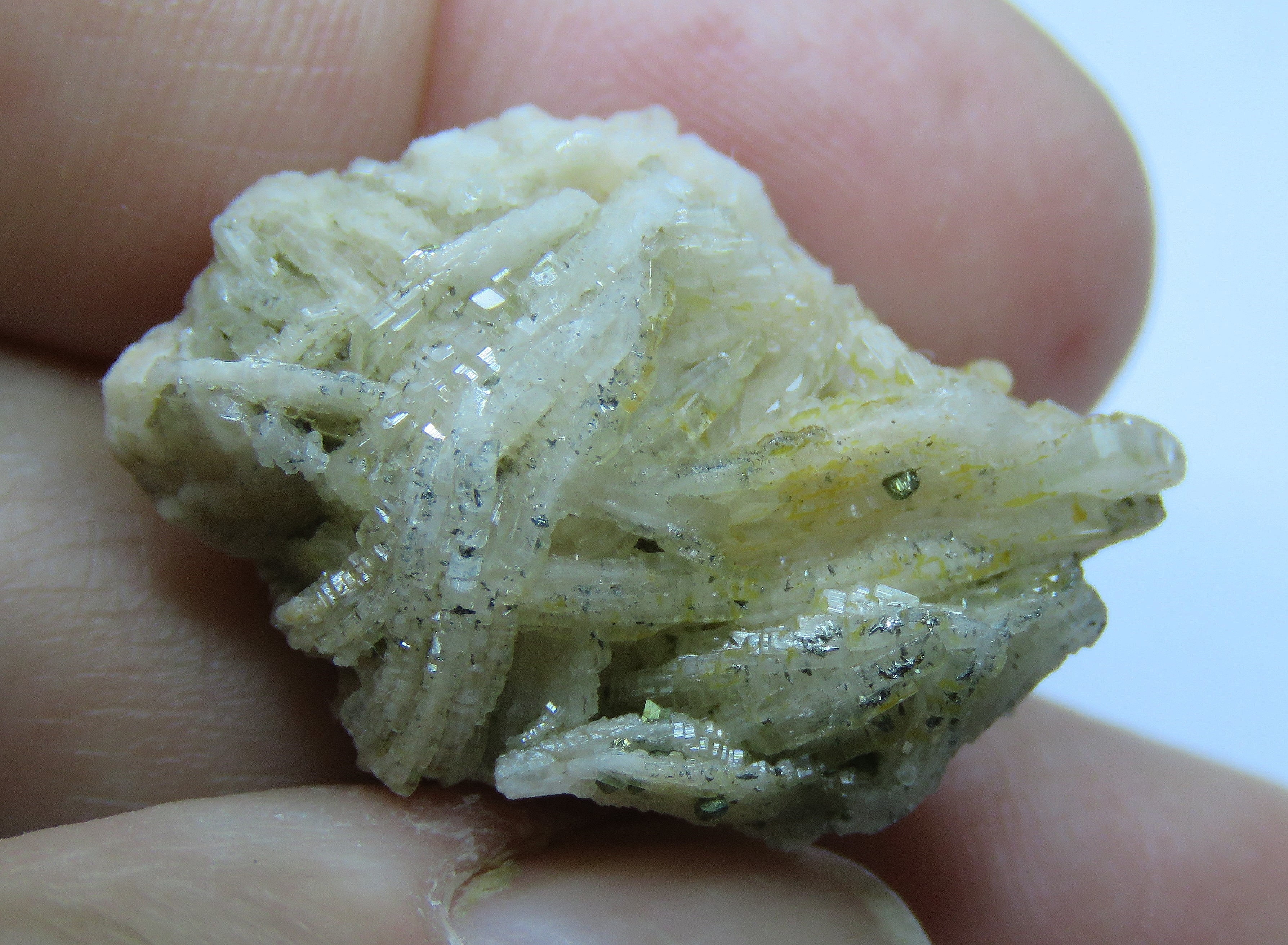Deux petites barytines tabulaires (2.5 et 2.8 cm de plus grande dimension), très riches en inclusions de sulfures divers, dont un m'intrigue particulièrement: de couleur blanc argent (ce qui ne ressort pas trop sur mes photos), en forme de bacilles ou de navettes effilées, un peu tordues, à section plus ou moins carrée. Une idée sur ce que ça peut être ?
