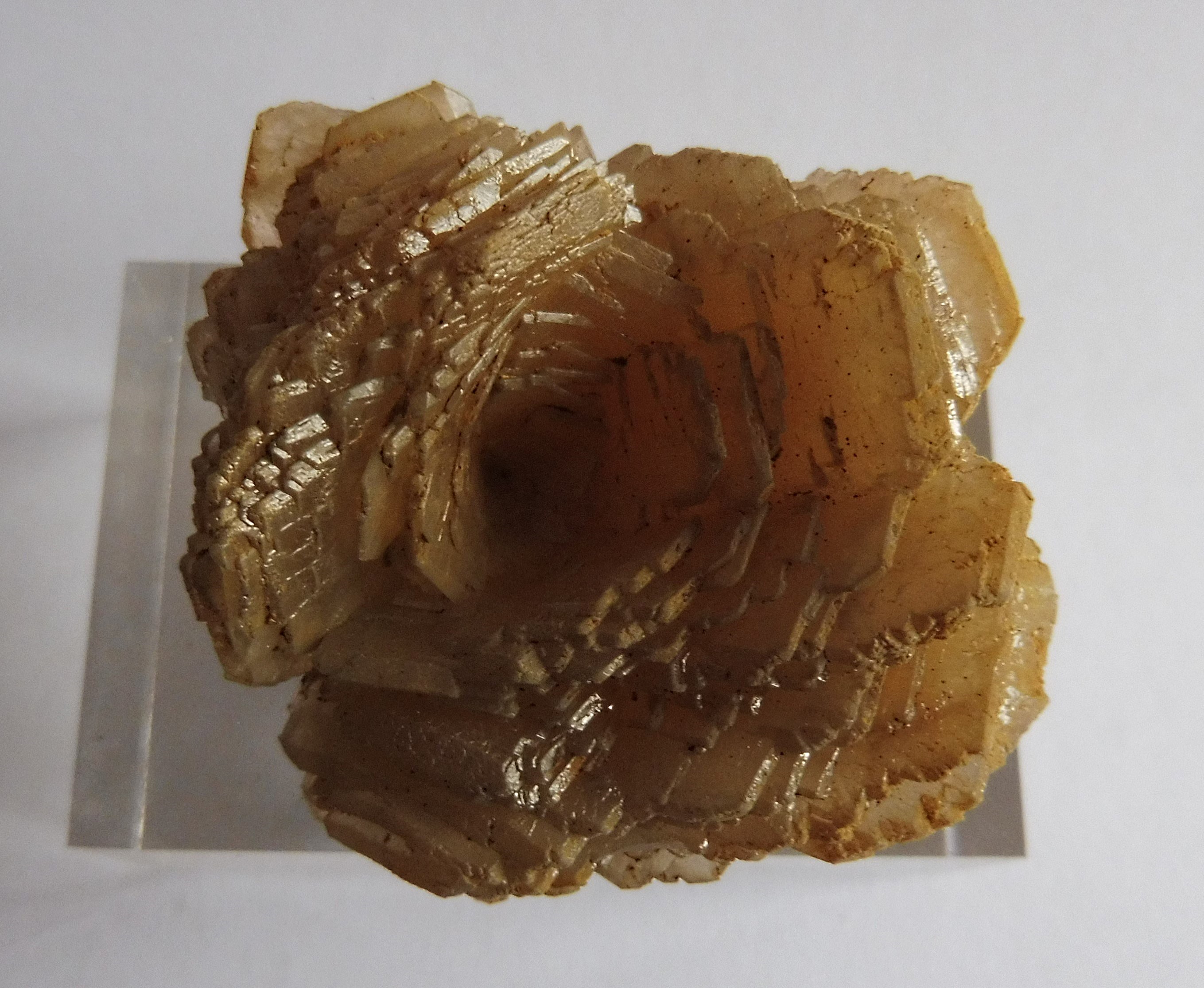 Une jolie rose (flottante) de cristaux de barytine jaune (à fluorescence brun-jaune) de Montmirat (4 cm).