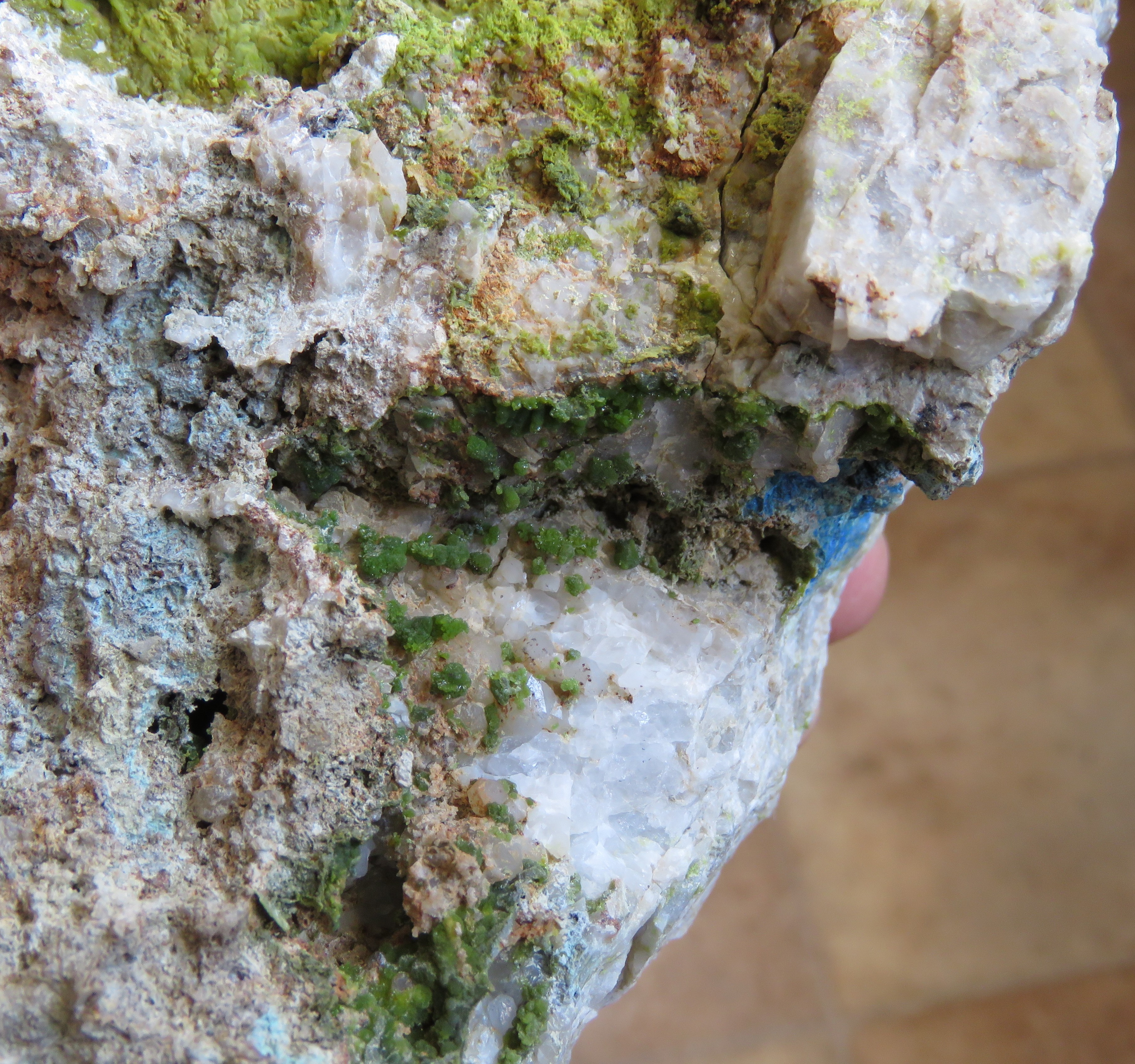- dans le quartz carié (dissolution de la galène et chalcopyrite): pyromorphite et linarite.