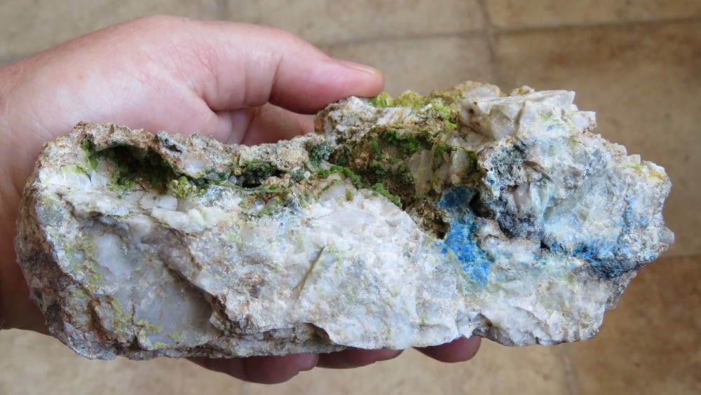 Autres lieux lozériens, autre "faune" minéralogique d'un site (aujourd'hui détruit) du contrefort nord du Mont Lozère, un filon de quartz à plomb et cuivre qui fut seulement trahi par ses déblais (extrêmement modestes) témoignant d' une exploitation ancienne, peut être antique ou médiévale.