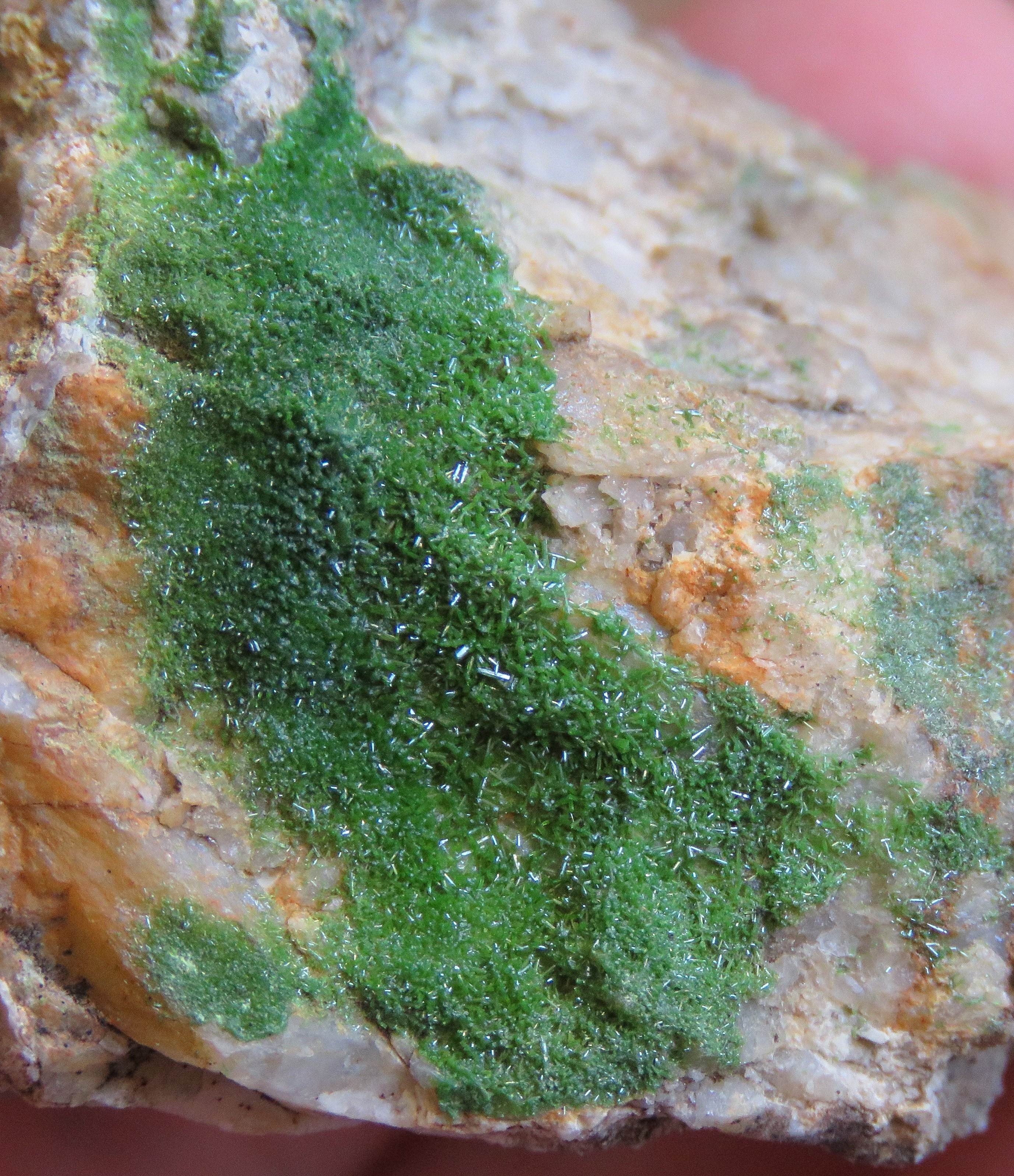 - autres aspects de la pyromorphite sur cet indice : tardive dans les fissures du quartz. Sur la pyromorphite, de rares petits cristaux orange vif en pyramides aigües à 4 faces, wulfénite ou stolzite… Non répertorié.