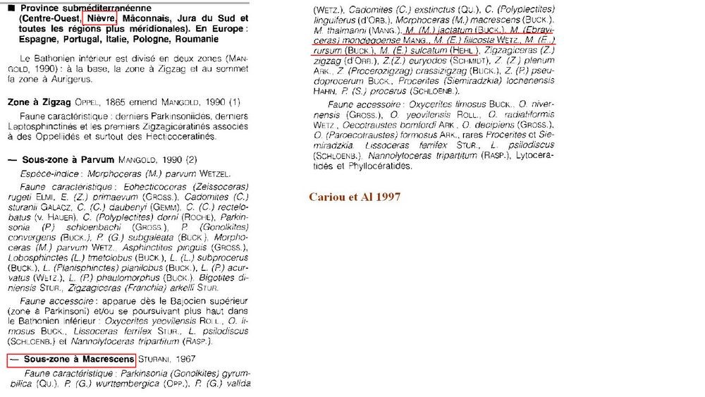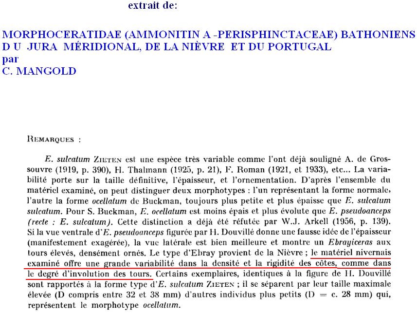 Par contre Mangold dans ses études sur le Bathonien de la Nièvre cite: E sulcatum/pseudoanceps, E ocellatum, E rusum, E jactatum et E filicosta pour cette même région.