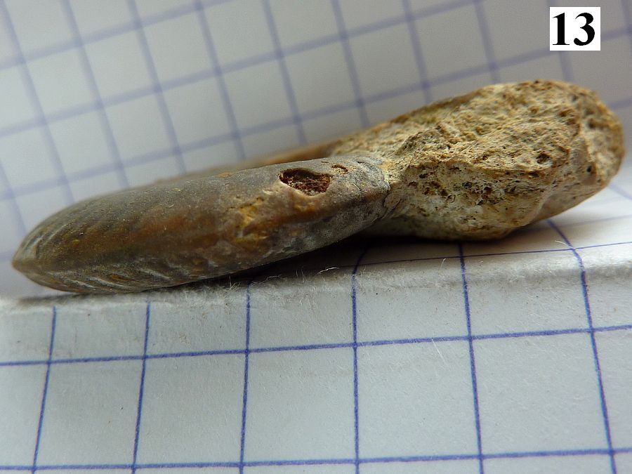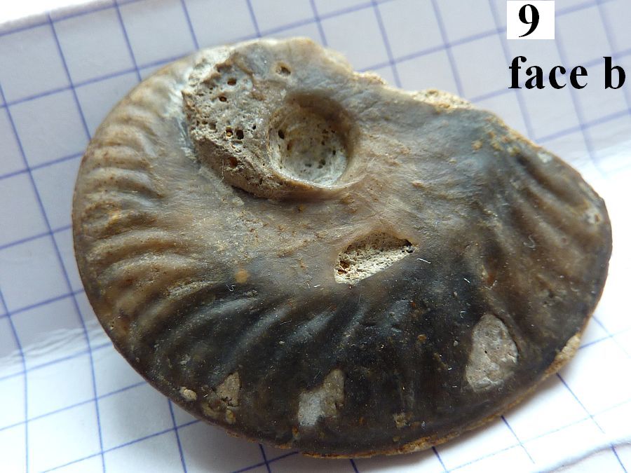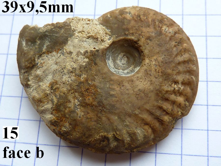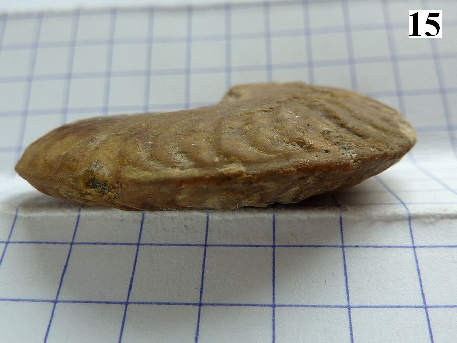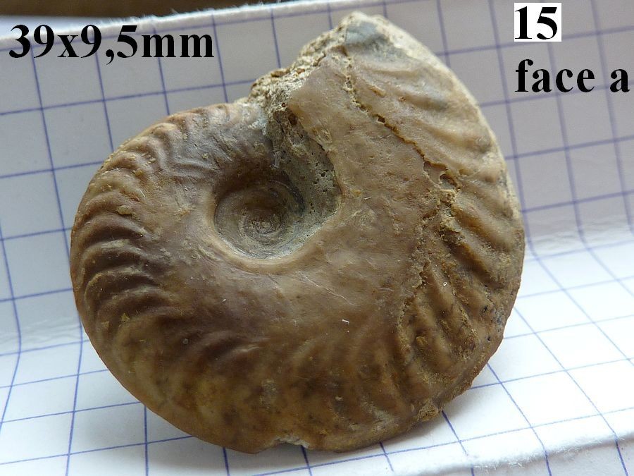 - n° 15 taille moyenne, pas de stries, côtes épaisses sur le bord ventral, ombilic large: Oecotraustes decipiens? O bomfordi? ou Oxycerites?