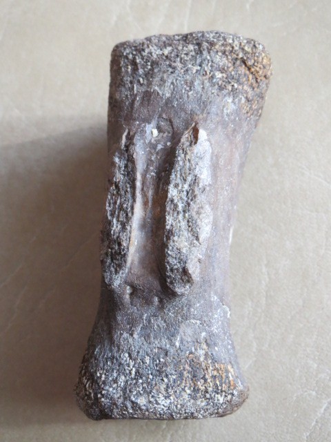 Elle fait 7,5 cm de long, 3,5 à 4,0 cm de diamètre et je suppose qu’il s’agit d’une vertèbre caudale du milieu de la queue.