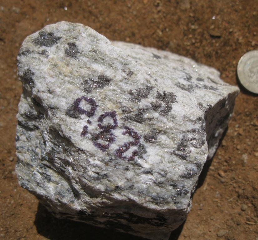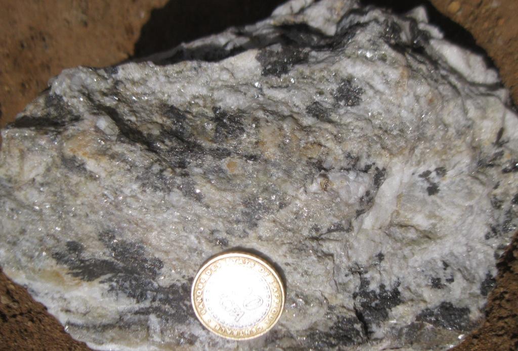 Les photo ci-contre illustre un échantillon de ce granite, contenant toujours les mêmes amas de minéraux noirs.