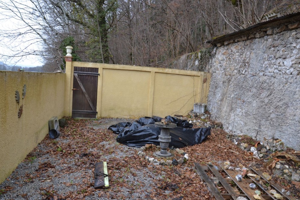 Voici le lieu à aménager. Comme vous pouvez le voir pour le moment rien n'est fait (si ce n'est des bouts de murs déjà là). J'ai cependant cassé pas mal de choses puisqu'il y'avait de gros encroûtements de béton sur le sol(vestiges d'une bétonnière débordée), des bacs à fleurs en pierres et ciments plus un arbre, joli mais pas vraiment d'intérieur.