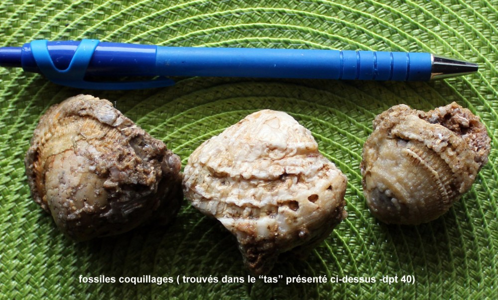 La plupart de ces coquilles sont des Glycymeris qui viennent du Serravalien des Landes. La fossilisation est aussi identique à celle que l'on peut trouver dans les anciennes carrières du côté de Gabarret.