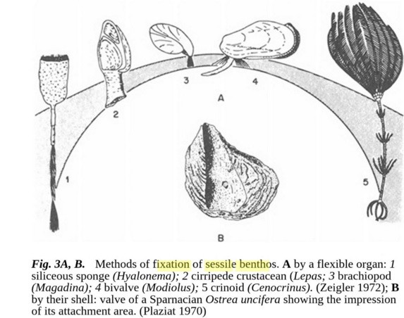 Pour se fixer, il faut augmenter au maximum la surface de contact dans le sédiment ; voir les exemples du benthos sessile : desmosponges et leurs spicules, crinoïdes et leur crampon etc.