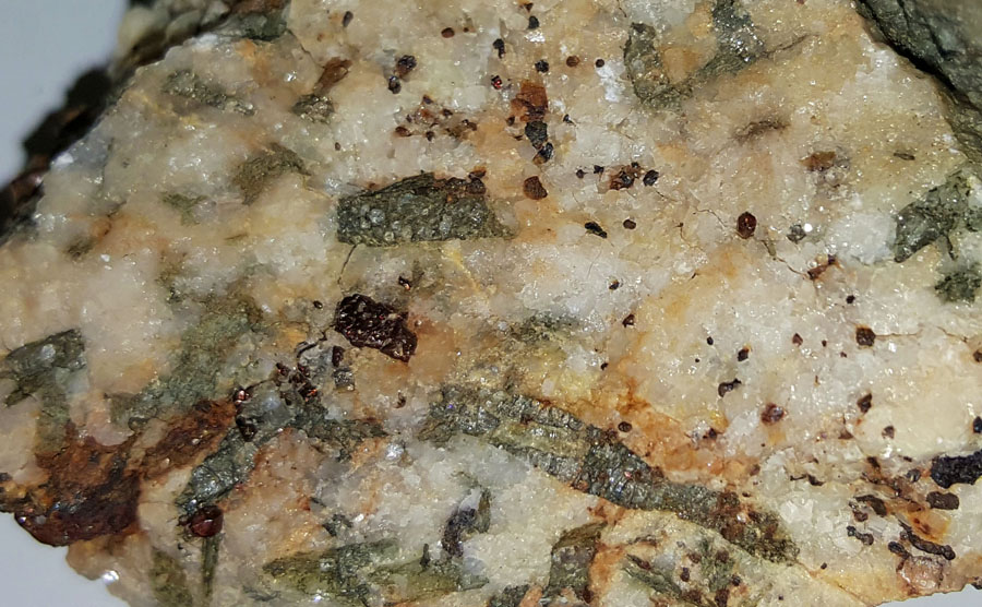 Je pense que tes déterminations sont bonnes, l'actinote est signalée, je l'ai trouvée dans une petite carrière secondaire en haut du site, à la couleur et à la forme dravite est fort possible, c'est pour moi un échantillon sympa. Pour le rose, vérifie que ça se raye à l'ongle, mais gypse rose il y a.