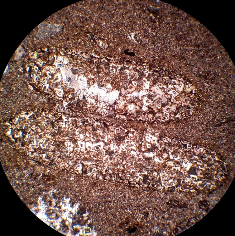 Deux ooïdes dissouts (les formes ovales). L'intérieur est recristallisé en dolomite (les rhomboèdres zonés) puis en calcite (au centre, en grands cristaux blancs).