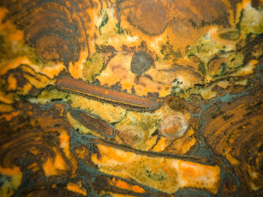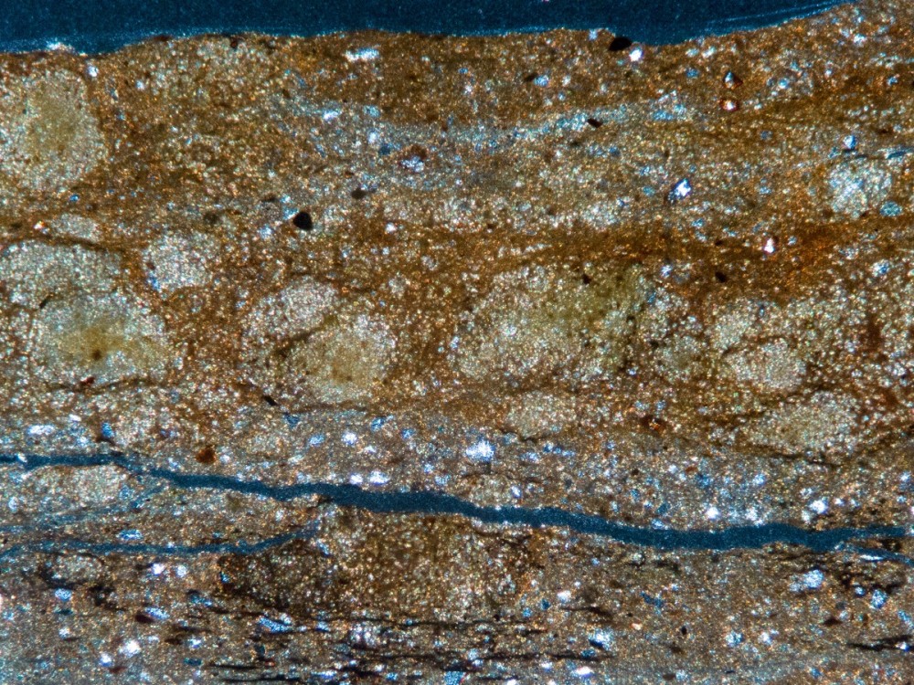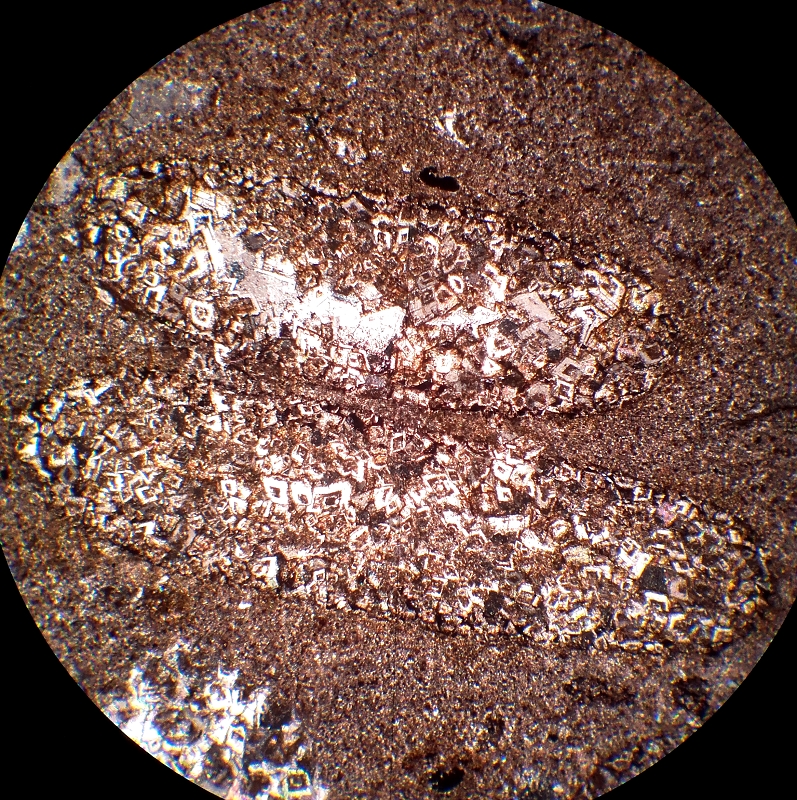 Les stromis en lame épaisse, ~1cm de plus grande dimension (APN en mode Macro). Les oncoïdes diagénétisés et les sphérulites de rhodochrosite (!), lame mince x25. (Coïncidence oui, mais jolies les tiennes !!!)