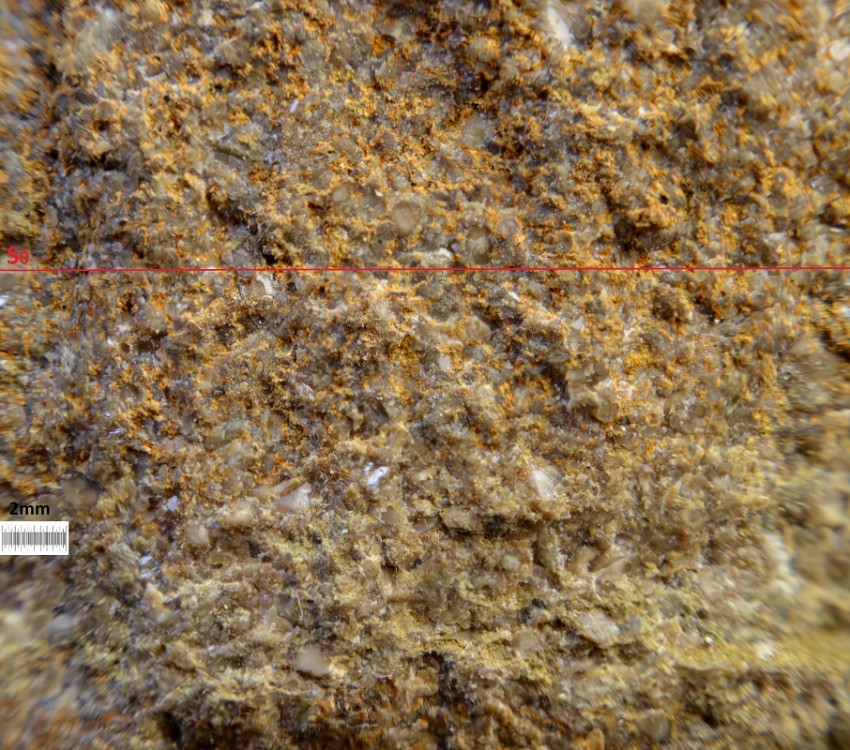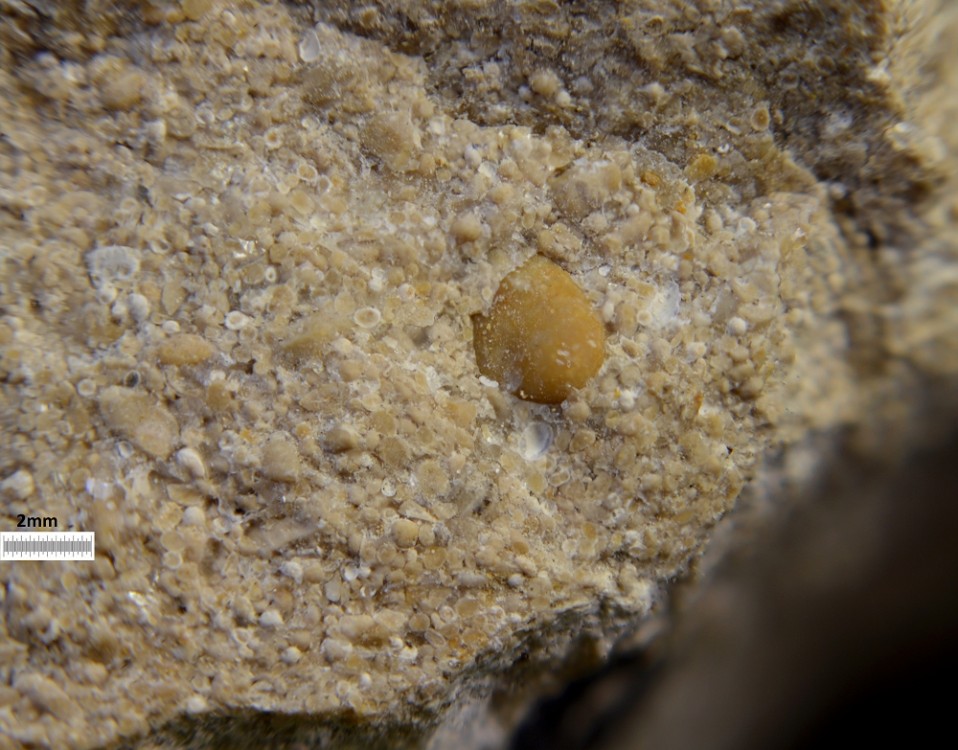 Au contraire, la présence de ciment micritique (comme dans le caillou précédent) indique un milieu de faible énergie (subtidal ou pélagique).