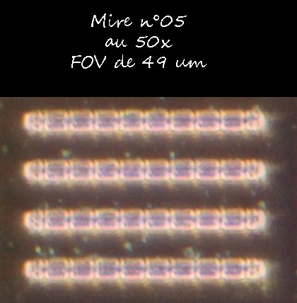 Pas très pratique ni reproductible mais les résultats ne sont pas aberrants. En cherchant bien dans l'image, on trouve des paires de lignes à la limite de la résolution. Il suffit de compter les pixels. Je tombe sur 1075 pour les LP/FOV (l'objectif est un 10x ON 0.25).