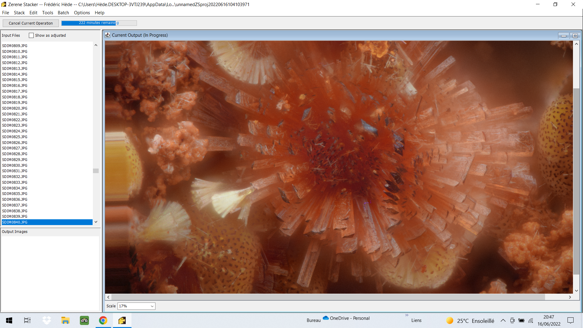 Par contre, on remarque quelques chapelets de pixels çà et là. De mon coté, j'ai résolu le problème (avec Helicon) en mettant tous les paramètres d'ajustement X Y, de rotation et de mise à l'échelle à zéro. Est-ce que tu peux faire la même chose avec Zerene ?