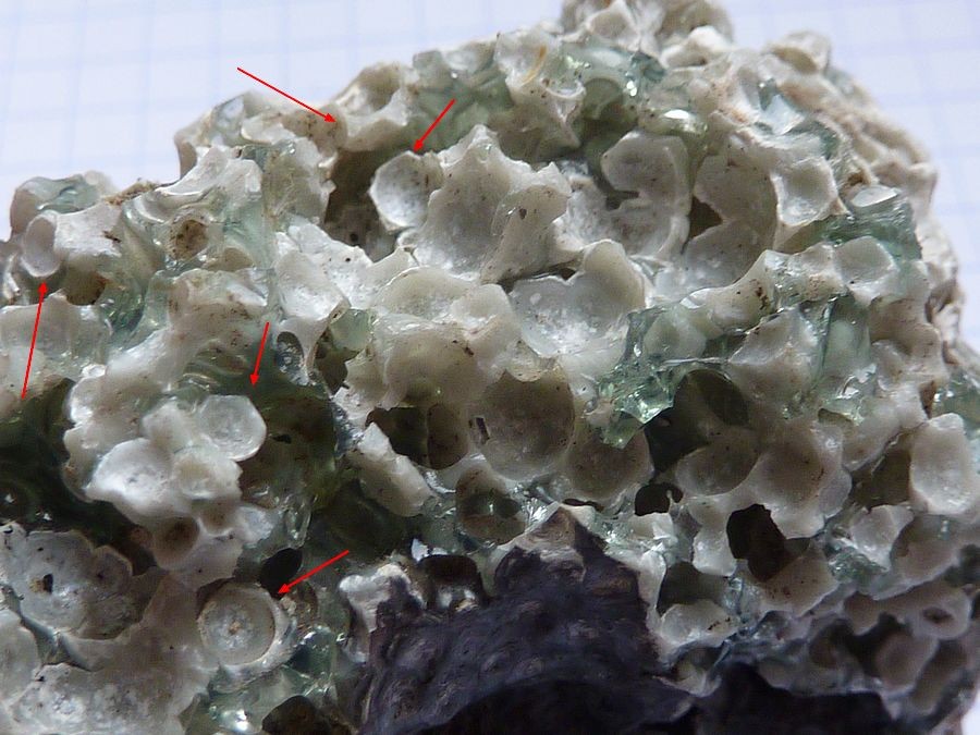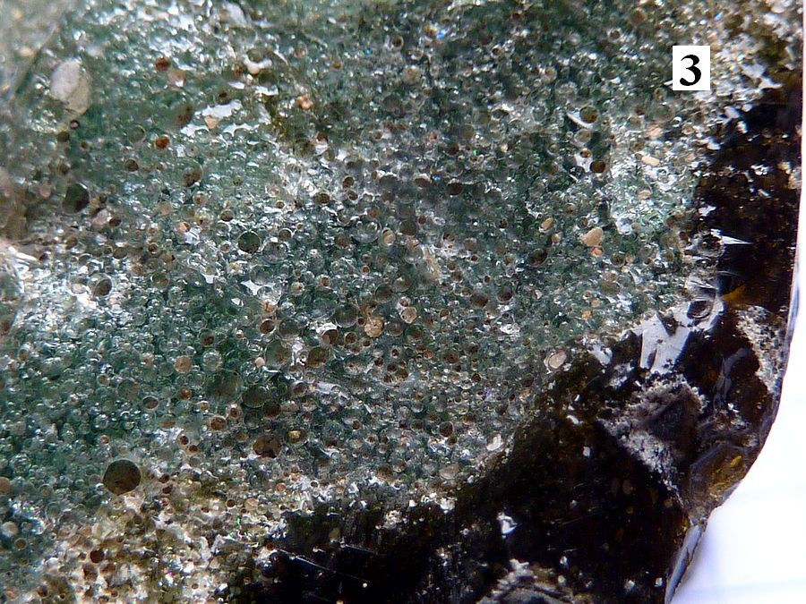 Différentes sortes de bulles dans les résidus de verrerie de St Léger des Vignes.