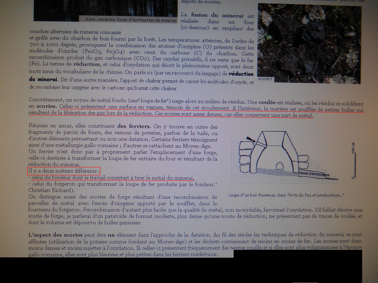 Ma foi ça pourrait être un extrait de wikipédia de la même façon qui ne fait qu'expliquer les différentes techniques utilisées. Objectivement, des scories comme celles ci il y en a en haut du col du Lautaret (où il n'y a pas l'ombre d'un minerai quelconque) et au site de haute altitude de Merlier, à proximité de la mine près de la forge. Pourtant pas de lien direct avec une exploitation