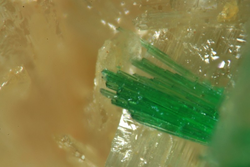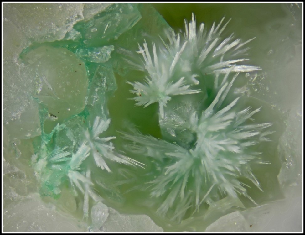 après trimage d'un de ces blocs de cérusite, j'ai trouvé cette petite gerbe verte