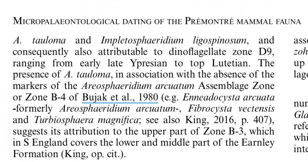 La biozone D9 s'étend du fini Cuisien au Lutétien sup (Lutétien moy our King 2016 en Mer du Nord). Etant donné l'oxydation des faciès et l'alteration des éléments cysts, je trouve très bancale leur explication.