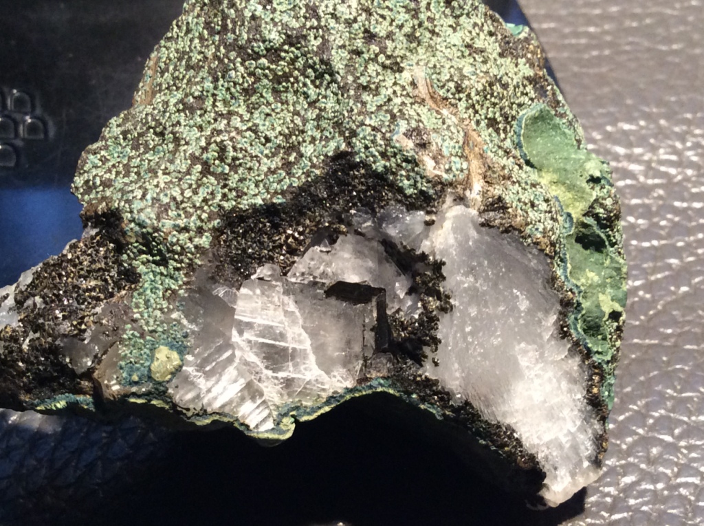 Elle mesure environs 5 cm et il y a un encroûtement vert sur la gangue.