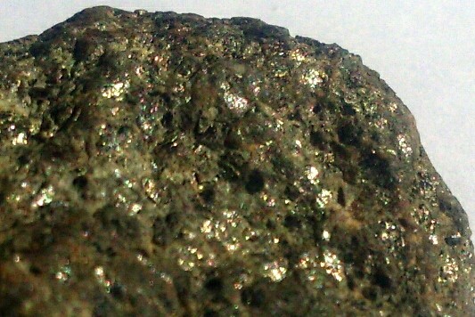 Sur la surface extérieure à l'oeil. On distingué d'un côté une roche plutôt verdâtre à noir avec différents types de cristaux noirs, certains reflétant très bien la lumière.