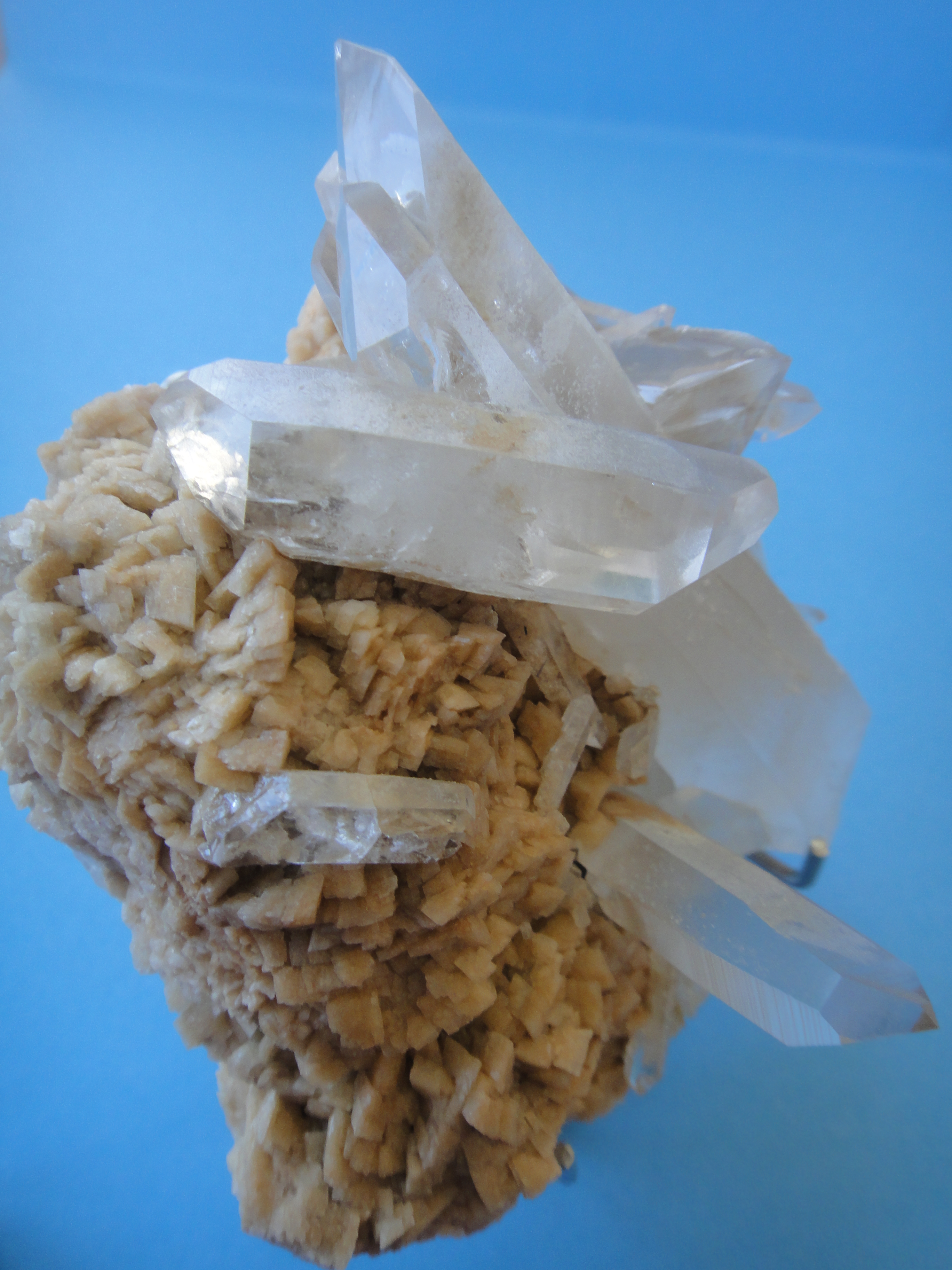 Quartz libre, impeccable sans coup, de 7 cm de long, courbe au millieu (manque de place lors de sa formation) favorisant ainsi une cassure en biseau recristallisée à sa partie inférieure, dessus des cristaux accolés de calcite 23 X 17 mm présentant sur le côté une dolomite maclée.