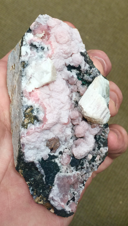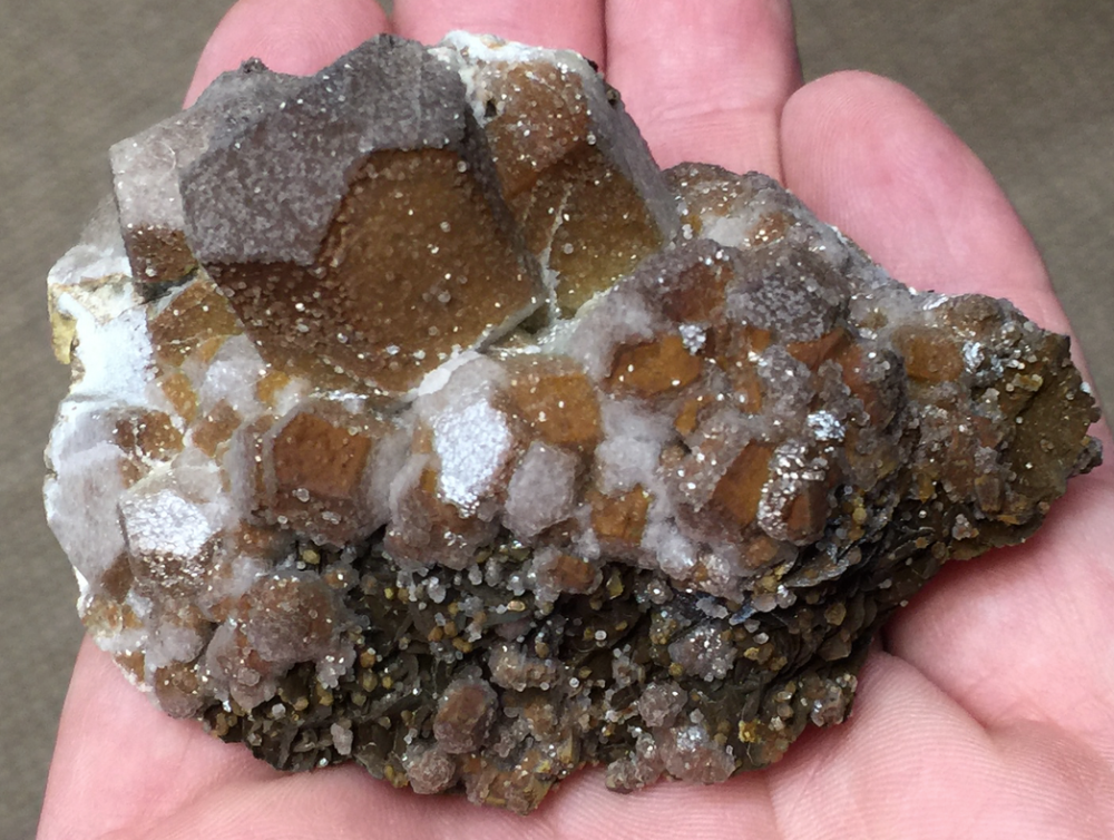 Calcite ferrifère totalement pseudomorphosée en ce qui semble être un mélange Sidérite/Limonite avec une croûte de Calcite blanche. La calicte forme un 'dead-box' autour du prisme de carbonate, correspondant sans doute à une défunte fluorine !  [70mm]