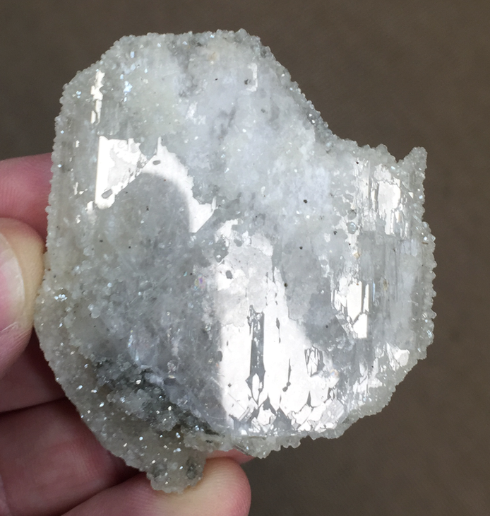 Barytine tabulaire très légèrement bleutée partiellement incrustée de Calcite. Spécimen détaché. [50mm]