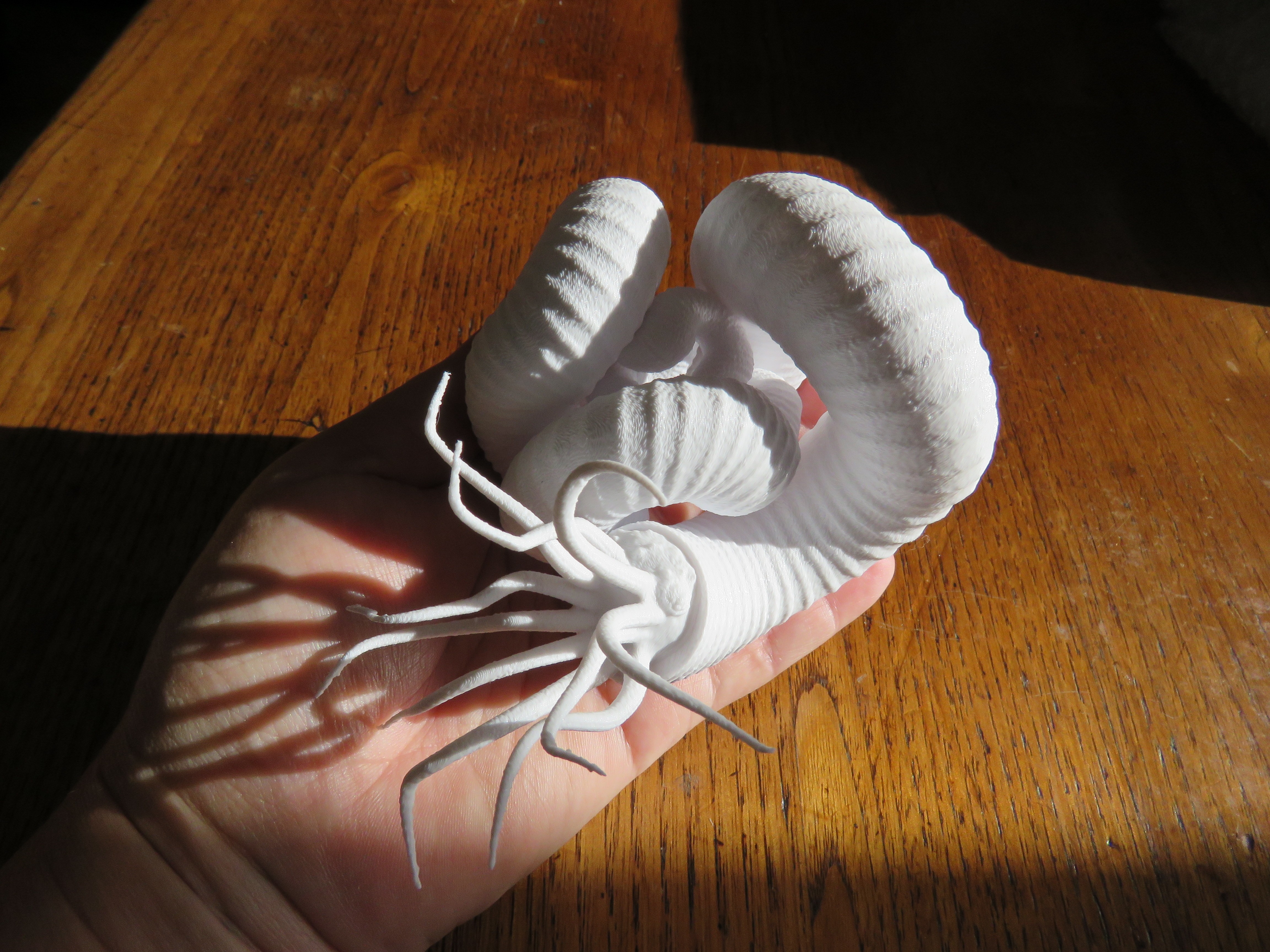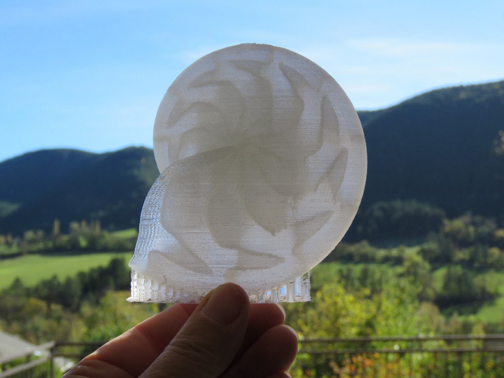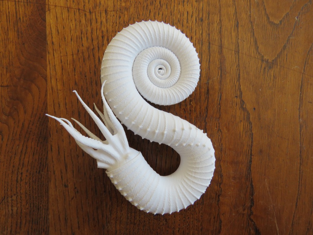 J'ai reçu ces modèles aujourd'hui, découverts juste ce soir, en rentrant du boulot... Au premier regard, évaporée la fatigue de la journée, juste scotchée par la perfection d'ensemble de ces coquilles...Un peu comme tout chasseur d'ammonites hétéromorphes pourrait les imaginer dans ses rêves les plus fous... Ce soir,  à la lumière d'une lampe de bureau, la texture de surface (qui est légèrement brillante avec une micro structure complexe) se révèle superbe ! Je vais les garder tels quels, comme des sculptures, ne pas les peindre, ce serait un crime ! Les cloisons du Didymoceras translucide sont très bien rendues. Sous un fort éclairage, on voit la précision de la ligne de suture. La surface texturée par l'imprimante 3D rend un aspect plutôt naturaliste: on pense vraiment à toutes ces coquilles à parois très fines, comme les argonautes, les xenophora, les pleurotomaires... Il y a bien sûr ça et là  quelques petites bavures de la machine, mais tout cela peut être aisément traité. Cependant, ces objets demeurent assez fragiles à cause de leur finesse même.