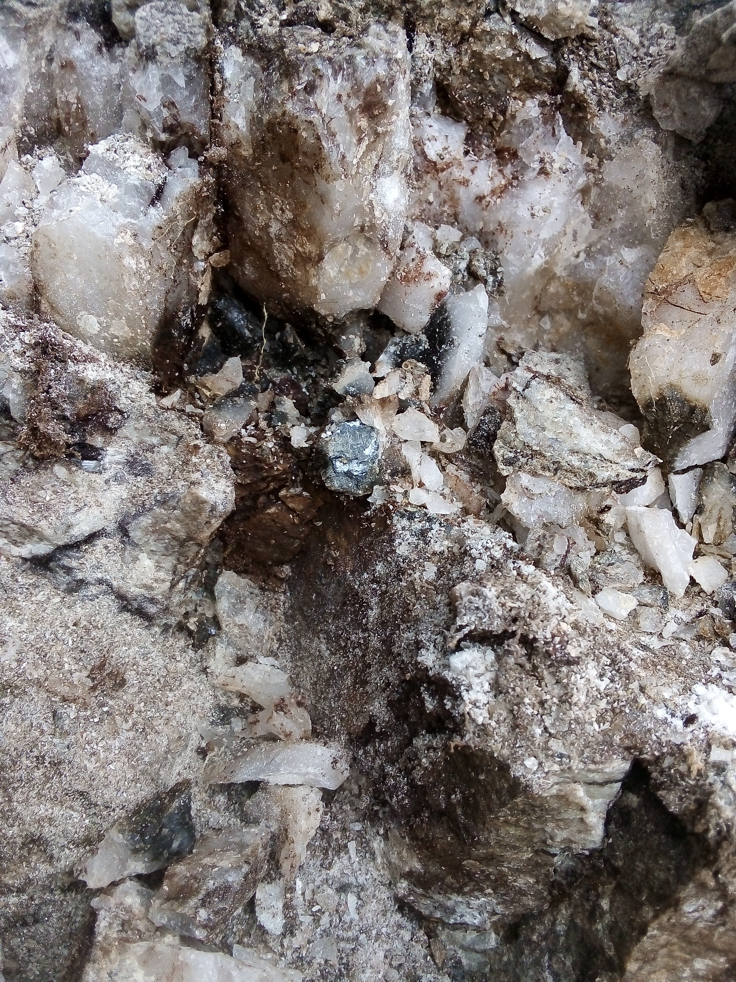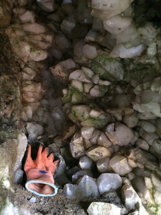 Idem pour cette grosse poche de gros quartz assez spectaculaire, inutile d'essayer de récupérer quelque chose, la roche encaissante est très dure et à tous les coups les cristaux se briseraient un par un si on cherchait à taper directement dans le filon. Mais quel régal ces quelques minutes à les regarder, juste pour le plaisir...