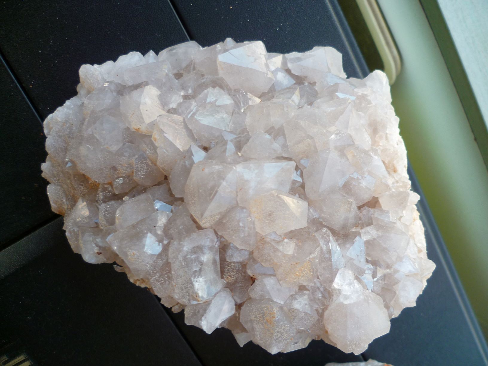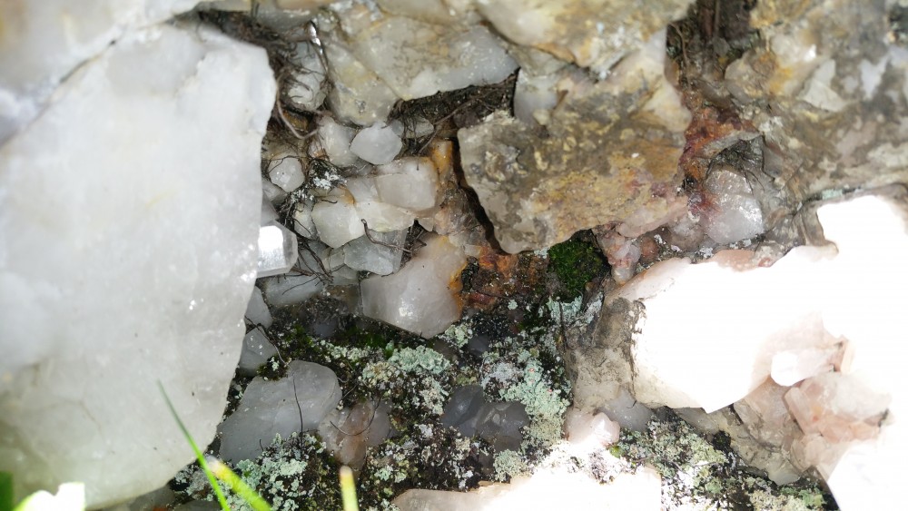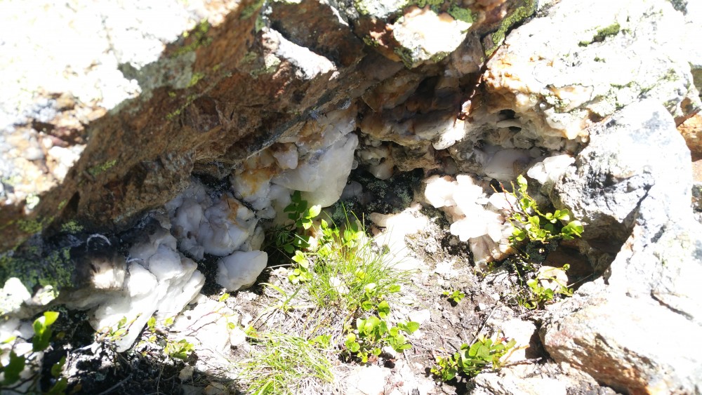 Quelque part en Maurienne (Savoie), Une plaque avec remplissage de cristaux d'adulaire de 1 à 2 cm parfois chloriteux. Bien sympa, mais je n'ai pas cherché à essayer de récupérer la plaque, je pense que j'aurai tout massacré. Laissons-la continuer à être visible dans son environnement pour émerveiller tous les randonneurs amoureux de la nature...