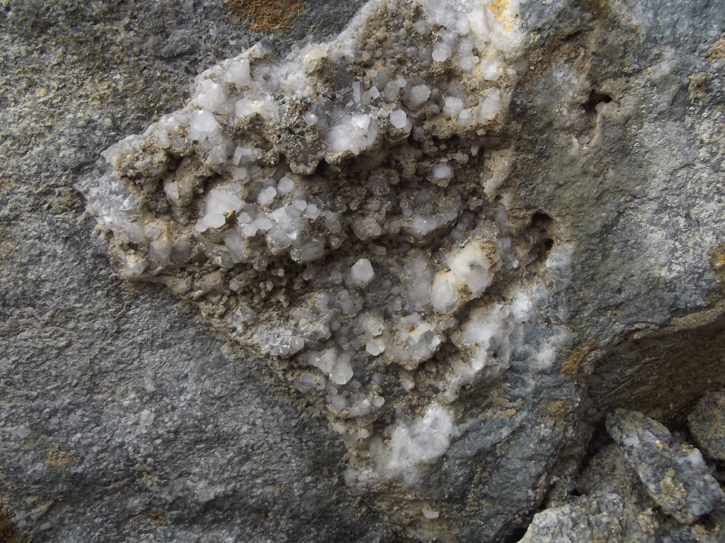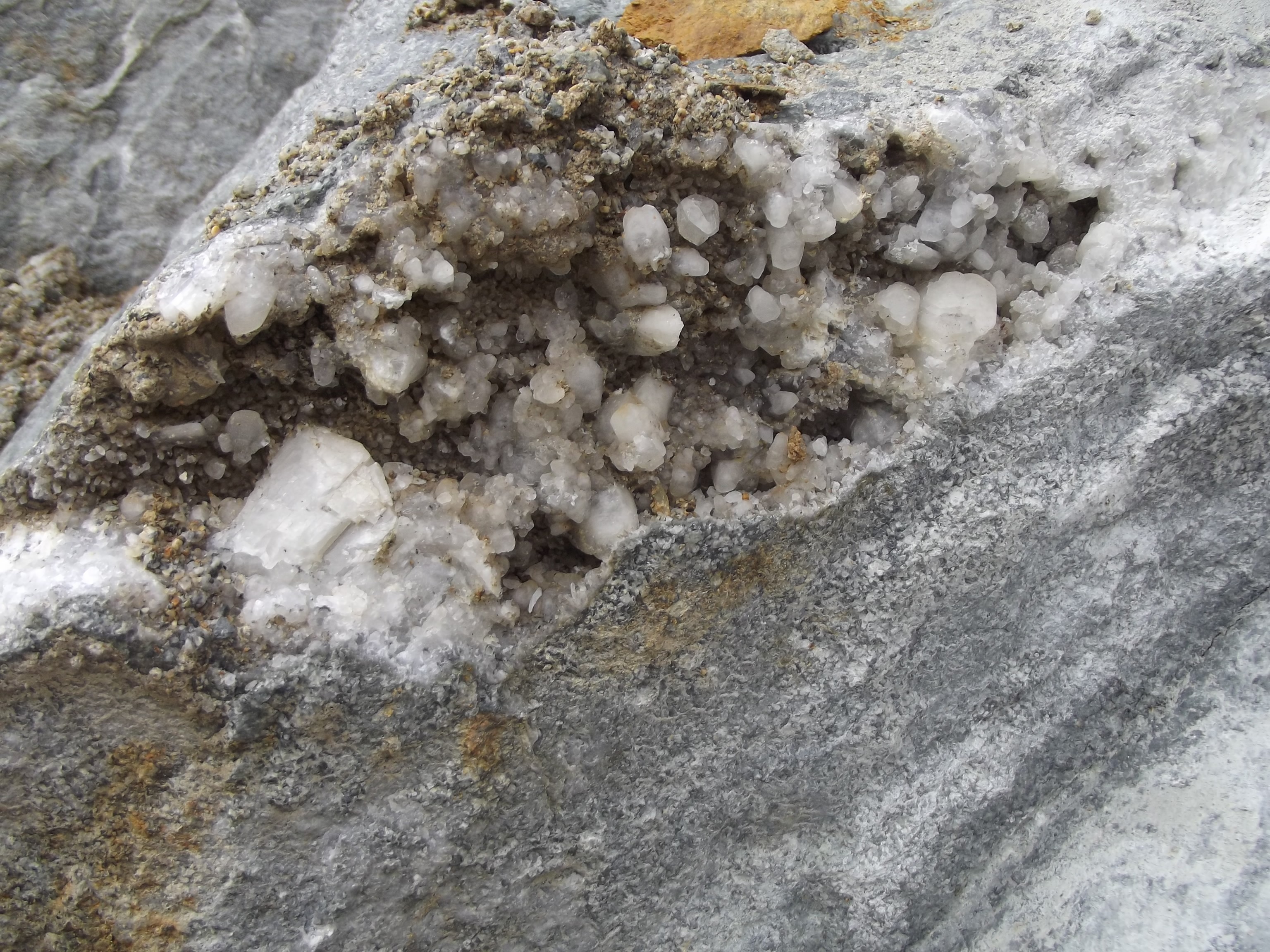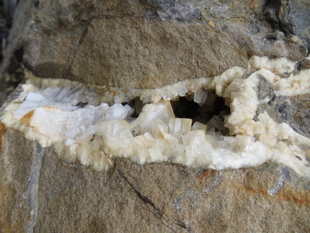 Après un éboulement, apparition d'une veine de calcite (la photo fait environ 15cm de large); Les rhomboèdres font jusqu'à 1,5cm de côté, et le gros cristal au centre est un quartz de quelques cm.